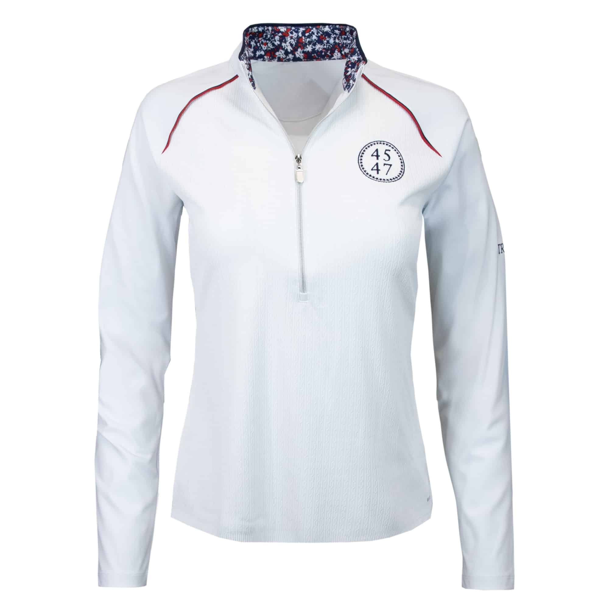 Function, fashion, and patriotism collide with the 45-47 ladies 1/2 zip. Designed for her, with a flattering fit and high quality technical material, outfit yourself for your next round of golf, walk, or workout class with the exclusive 45-47 logo featured on the left chest.