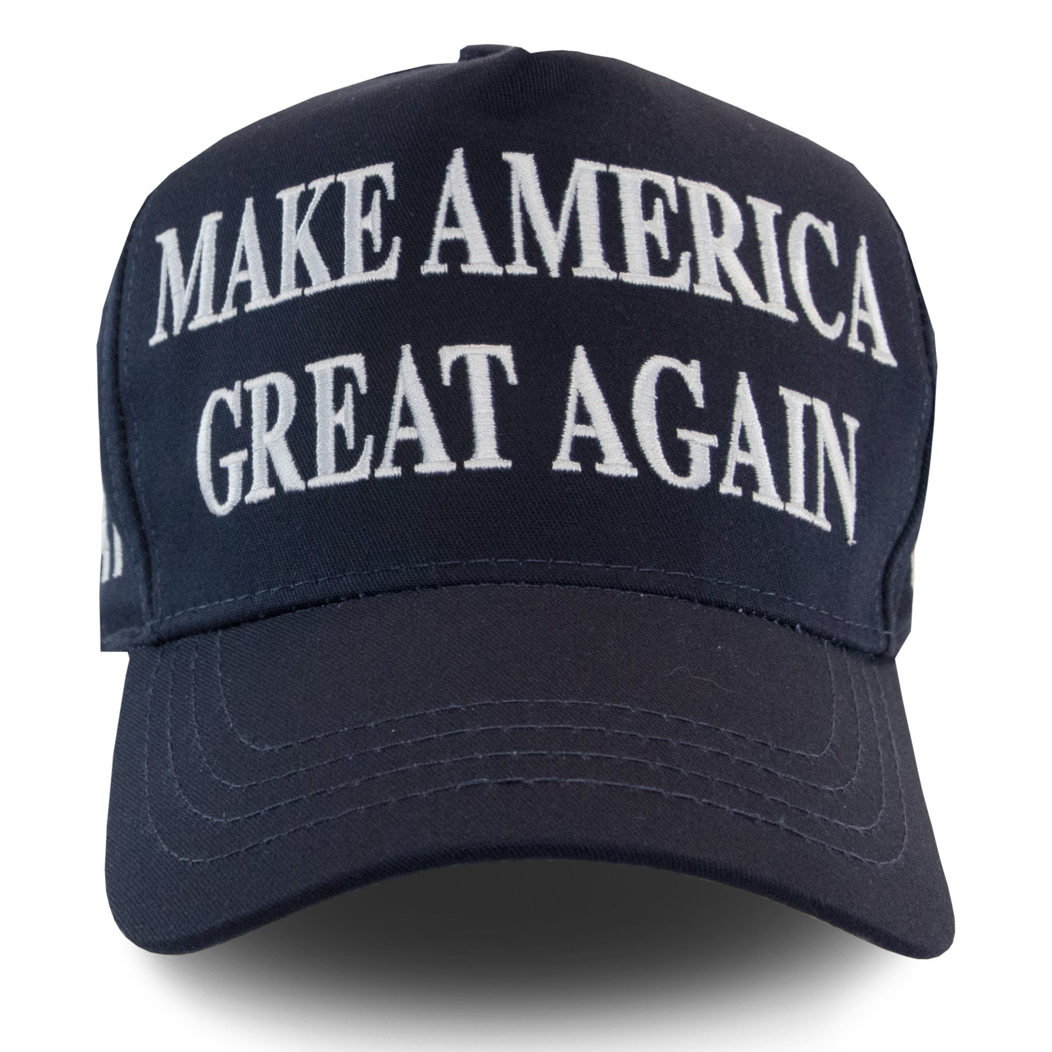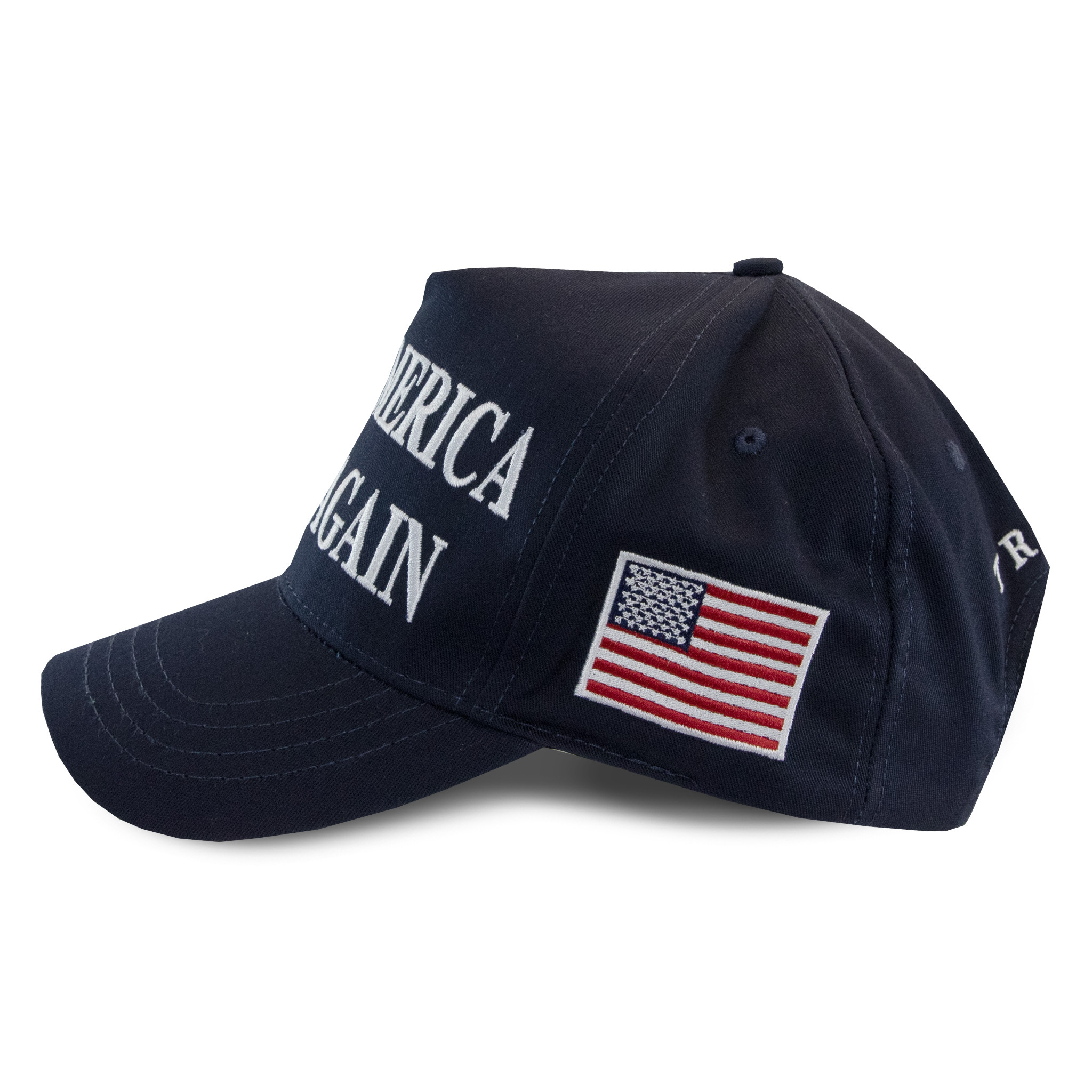Always a classic, the MAGA hat is now available in navy with white embroidered stitching. Featuring 45-47 on one side and the American flag on the other, show your love for America with the latest color.
