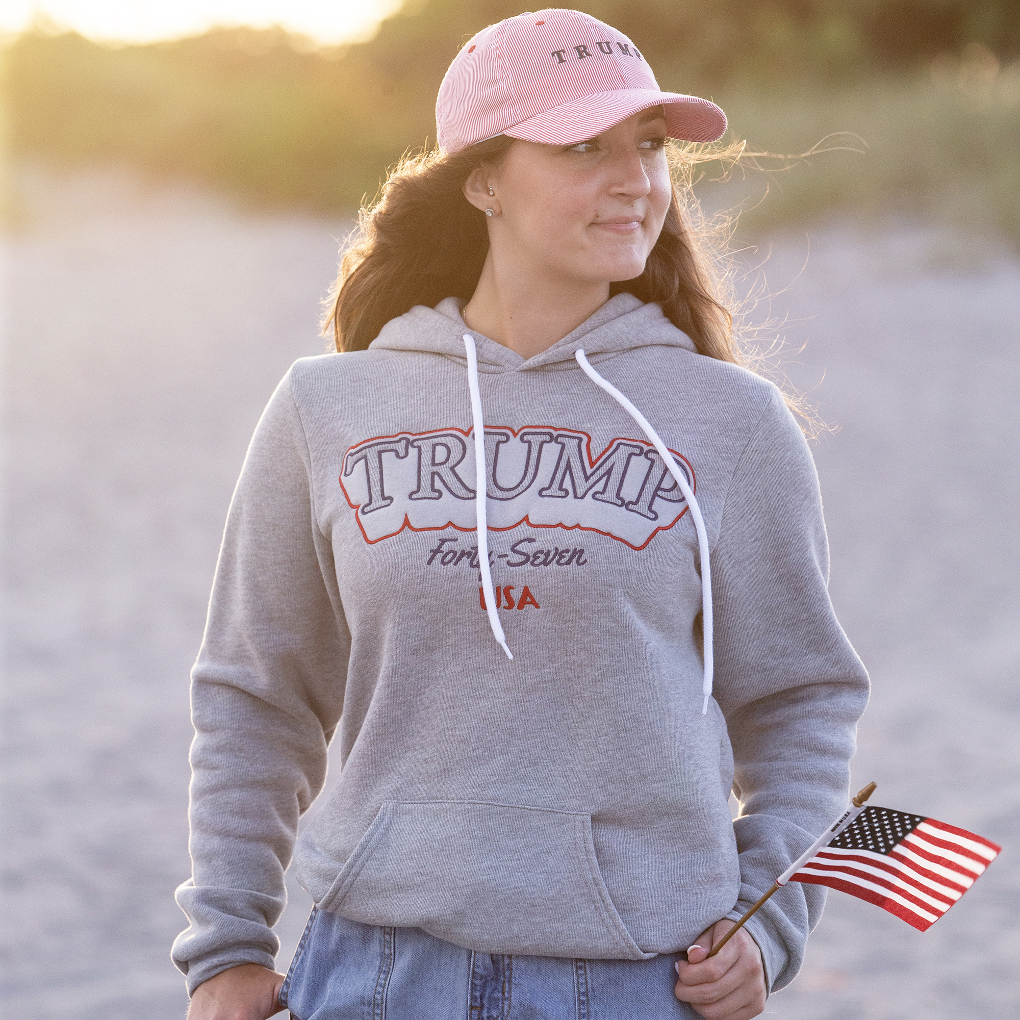 Prepare to own the most comfortable hoodie. Made in America of cotton blend fleece, this cozy and soft hoodie features the 47 Trump logo. This hoodie is a fun style for both him and her and works all year long.