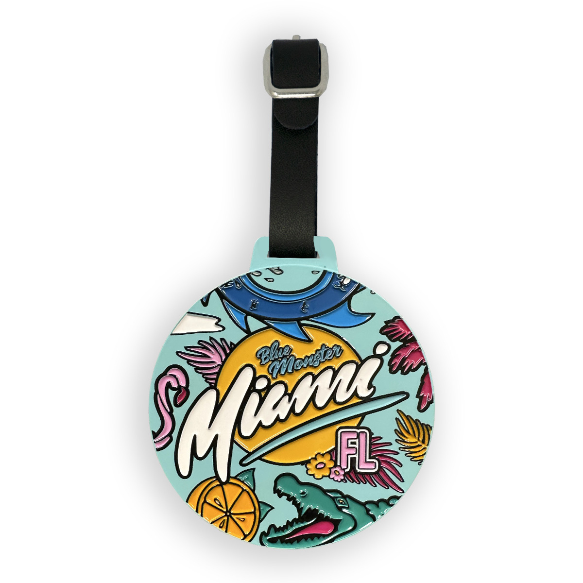 A colorful addition to your golf bag, this Trump National Doral bag tag features all the fun and all the danger of the famed Blue Monster golf course. From insane water traps, to the occasional hungry alligator, to bright sunshine and towering palm trees, this tag completes itself with the bold print inspired from the Art District of Miami.