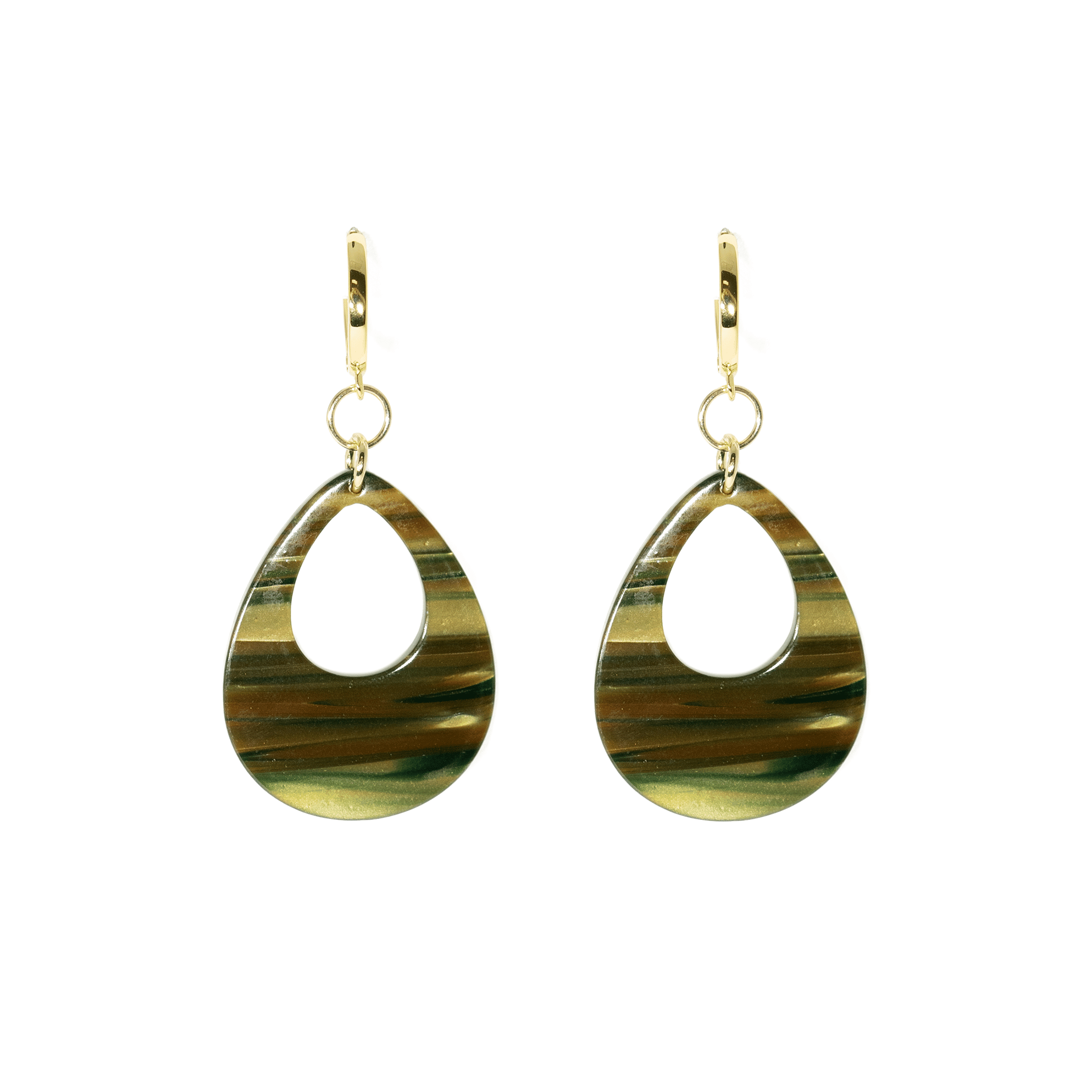 The companion to the Trump Tag necklace, this camo inspired tortoise motif is a great way to get in the fall camo spirit without going full blown camoflage. Perfect colors balanced with 14k Gold filled Huggies make these a super comfortable long earring to add to the mix.