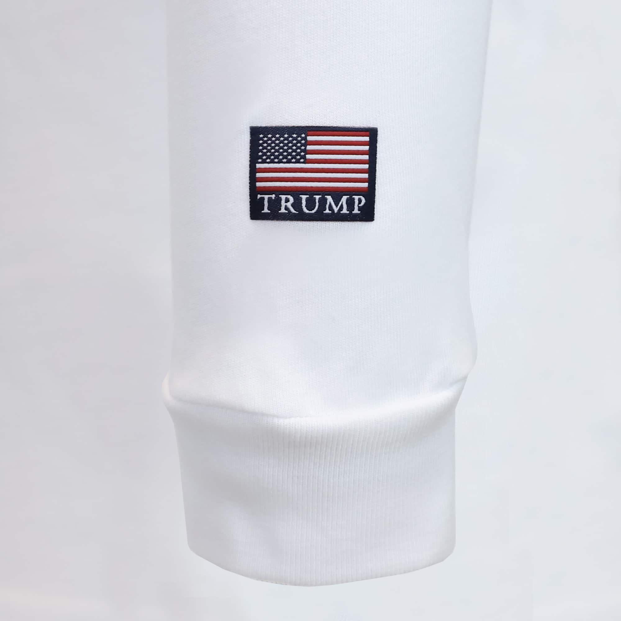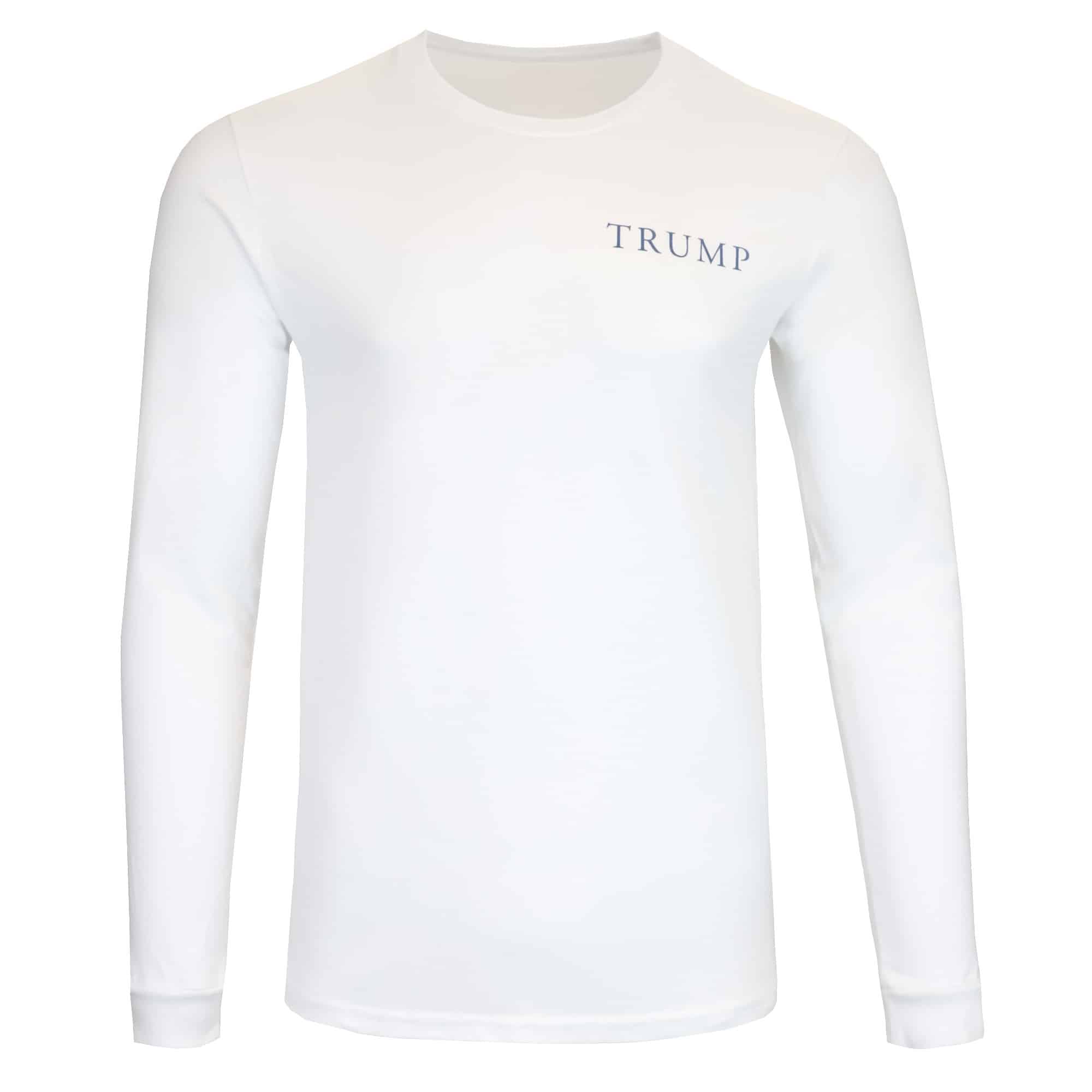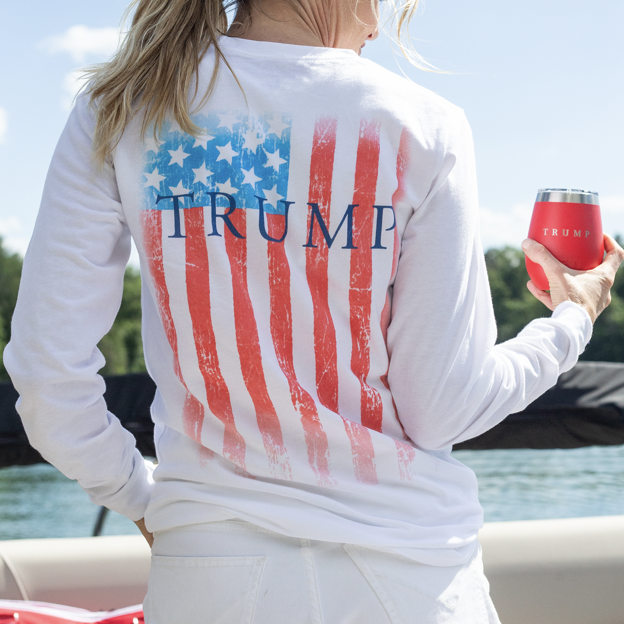 The distressed flag tee gets an appropriate update in a lightweight long sleeve tee styling. Front chest features TRUMP logo while the back features a distressed flag motif. Updated with a flag patch at wearer’s right wrist with TRUMP embroidery.