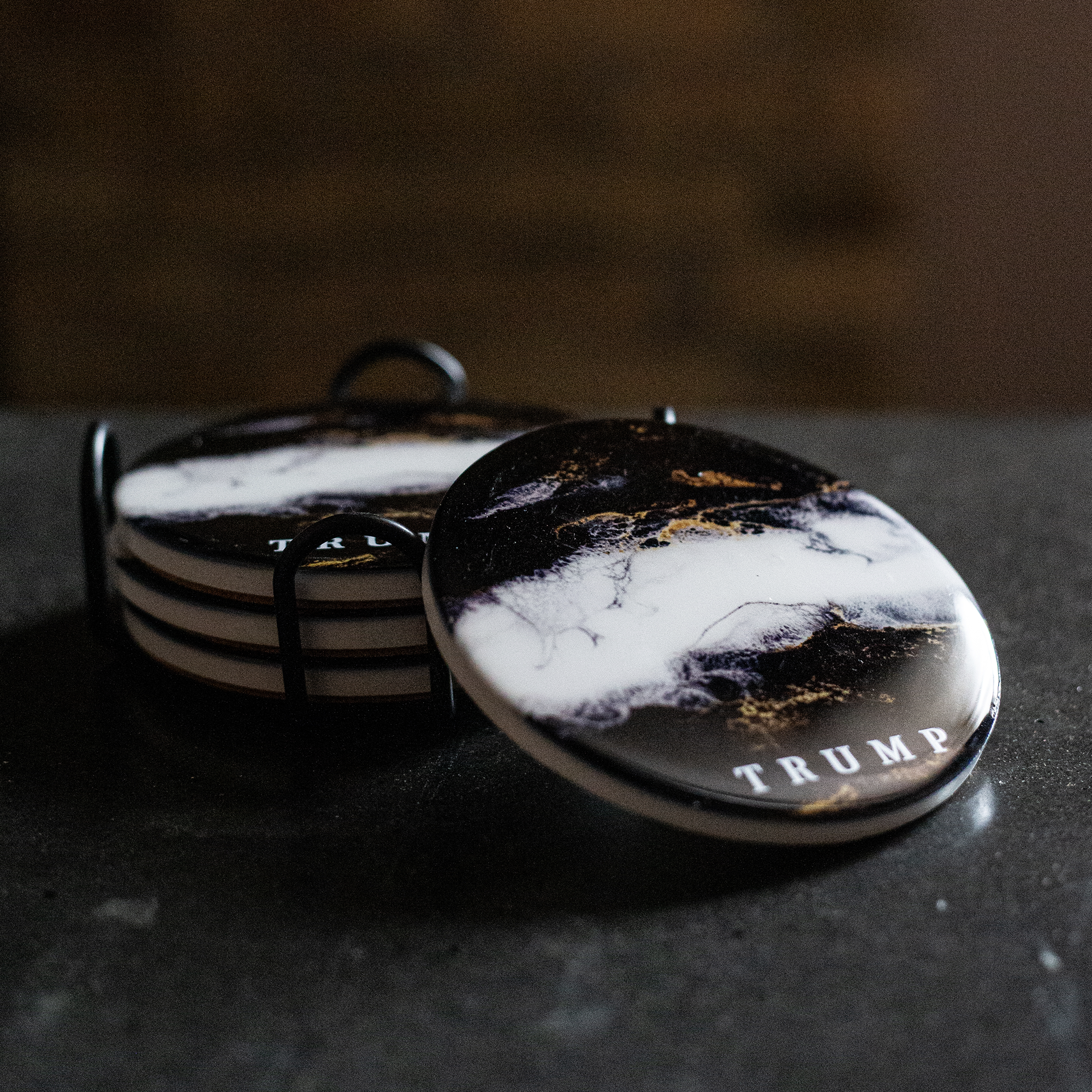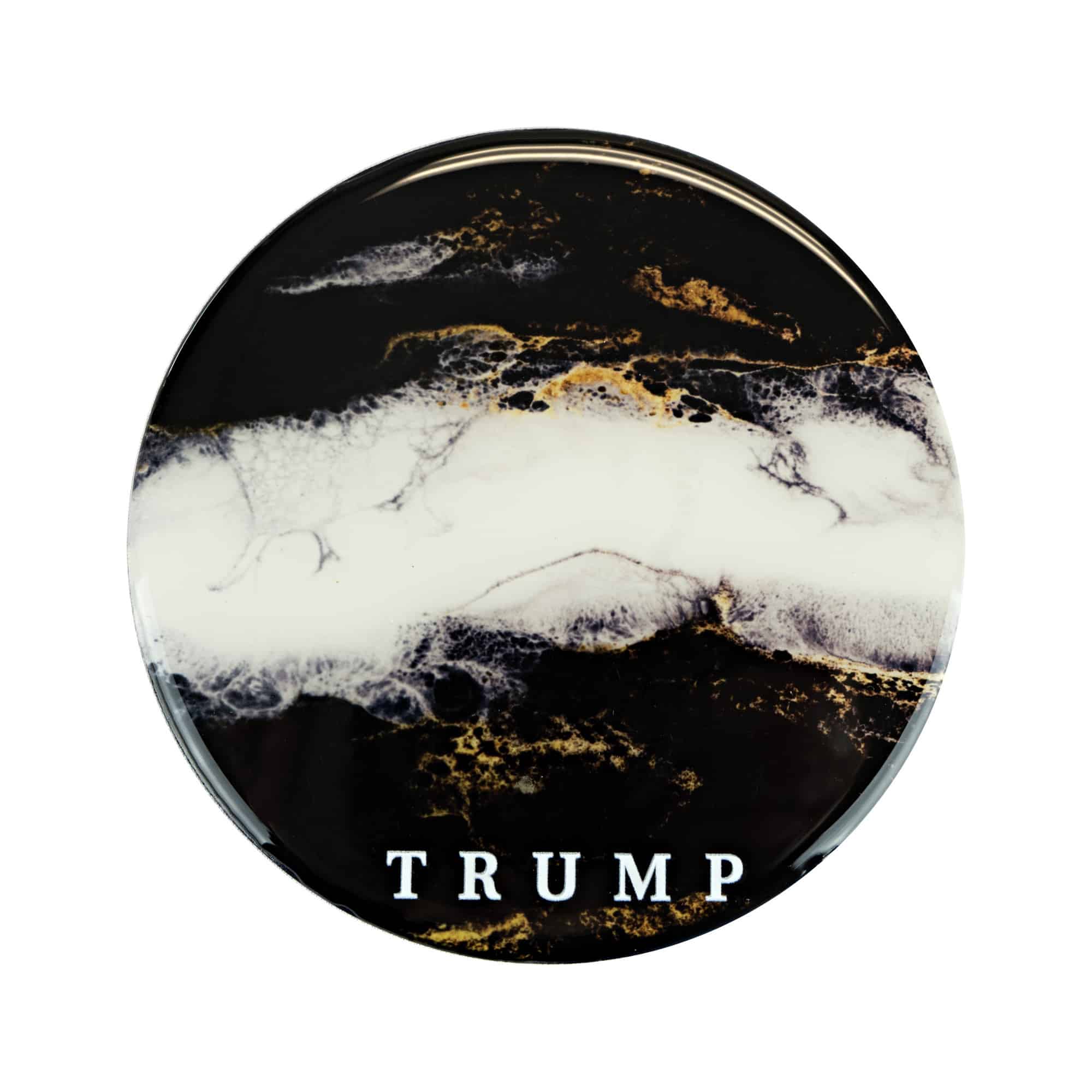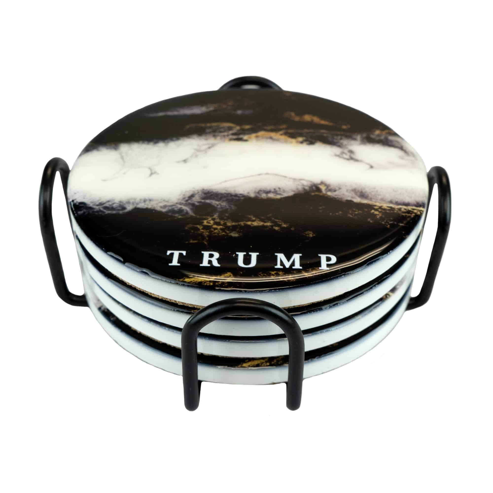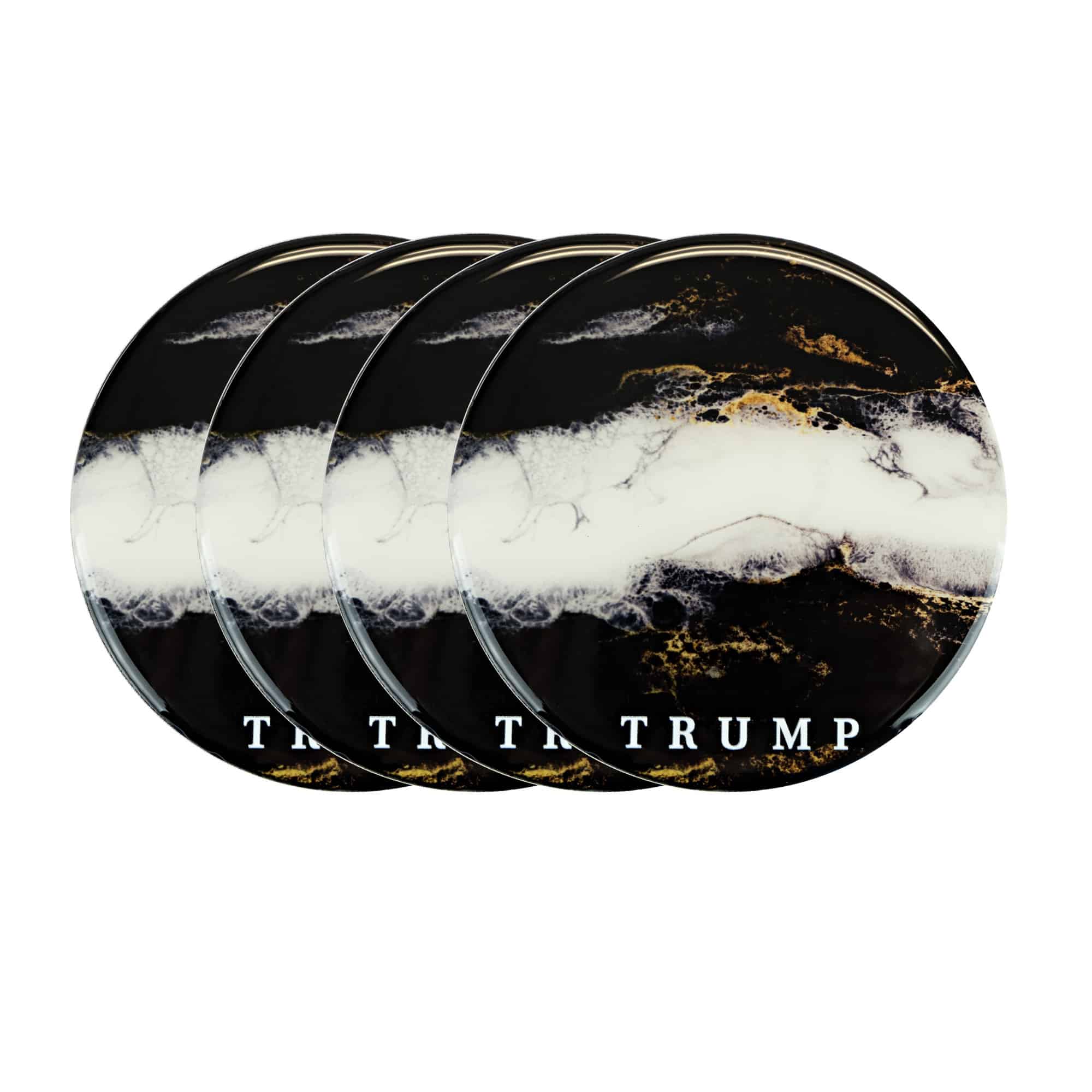 Set your beverages down with the reassurance and style found in our ceramic resin coasters. Sold in a set of 4, and made from high quality marbled ceramic, these are a coffee table statement. Black and white marbled with gold flecks. TRUMP logo.