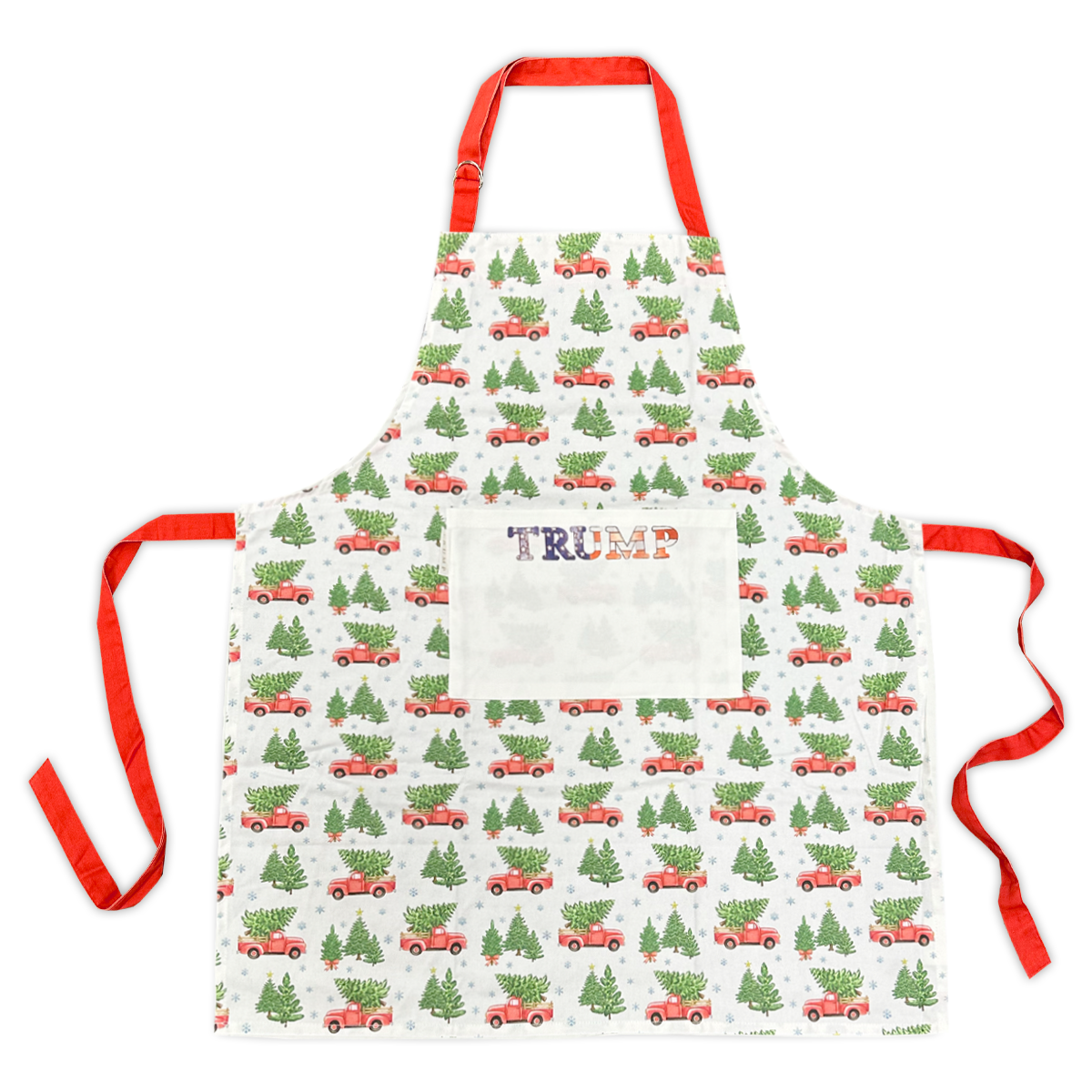 Serve up Christmas in style with the holiday apron featuring an old American truck and Christmas tee motif. Features TRUMP Logo on pocket. Adjustable straps.
