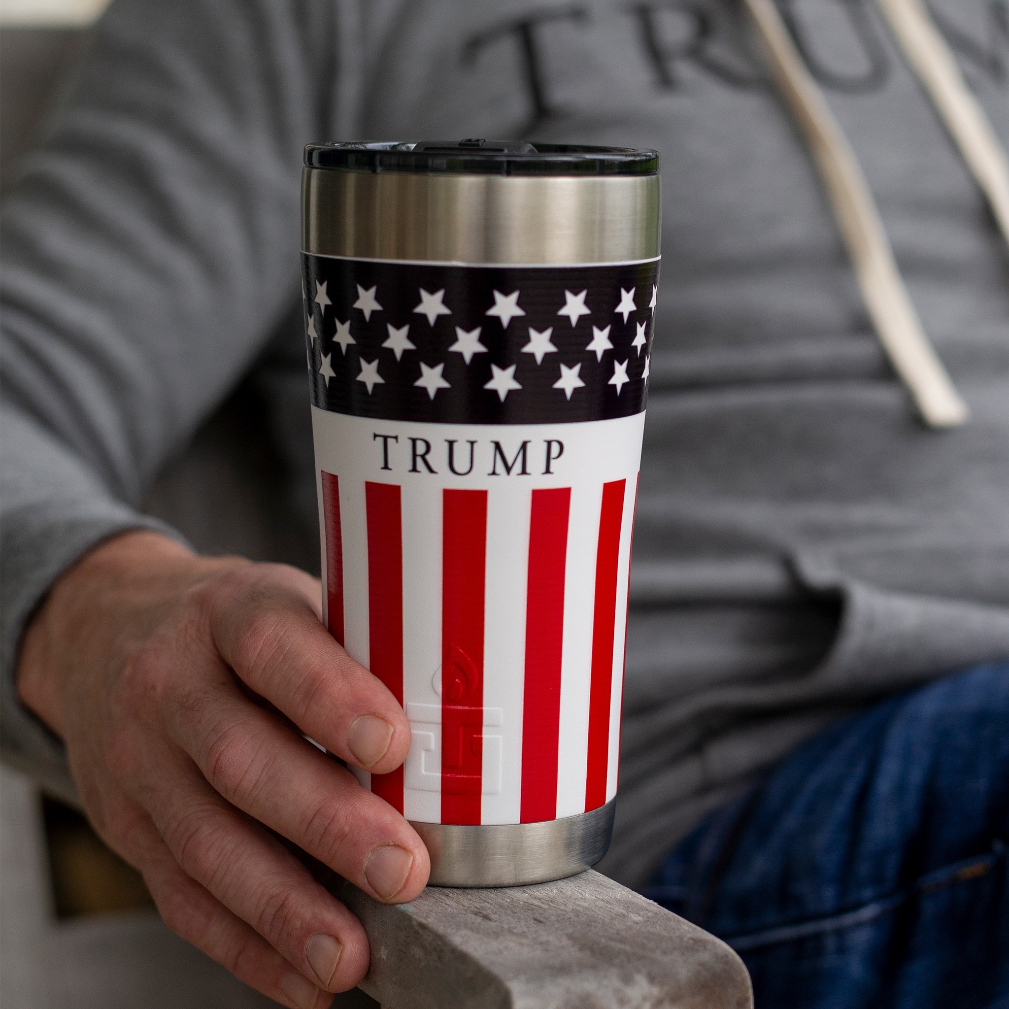 On the go but never without a fresh cup of coffee or cool smoothie. Keep your icy drinks ice cold longer and your hot beverages warm longer. With the American flag and the Trump logo this is your new go-to Tumbler!