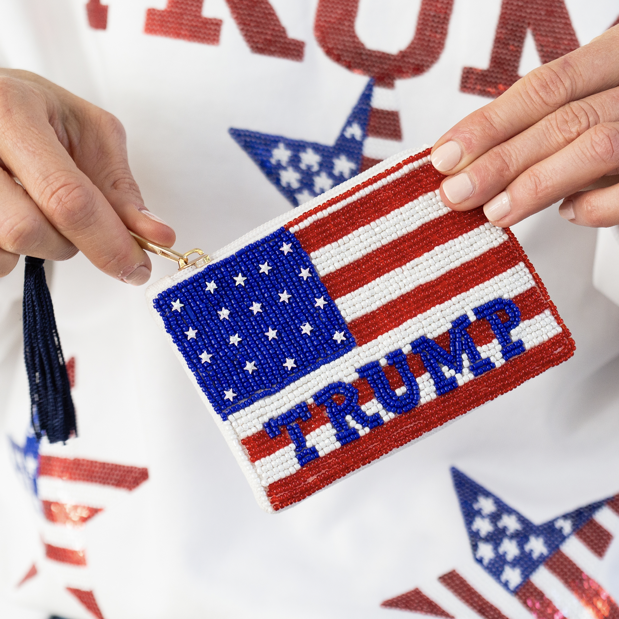 Hold your Georges, Benjamins, and more with this cute coin and cash purse. Beaded design features the American flag with TRUMP logo. Tassel accent on the zipper adds flair and fun! Perfect for on the go or in your purse to keep all your money in one place.