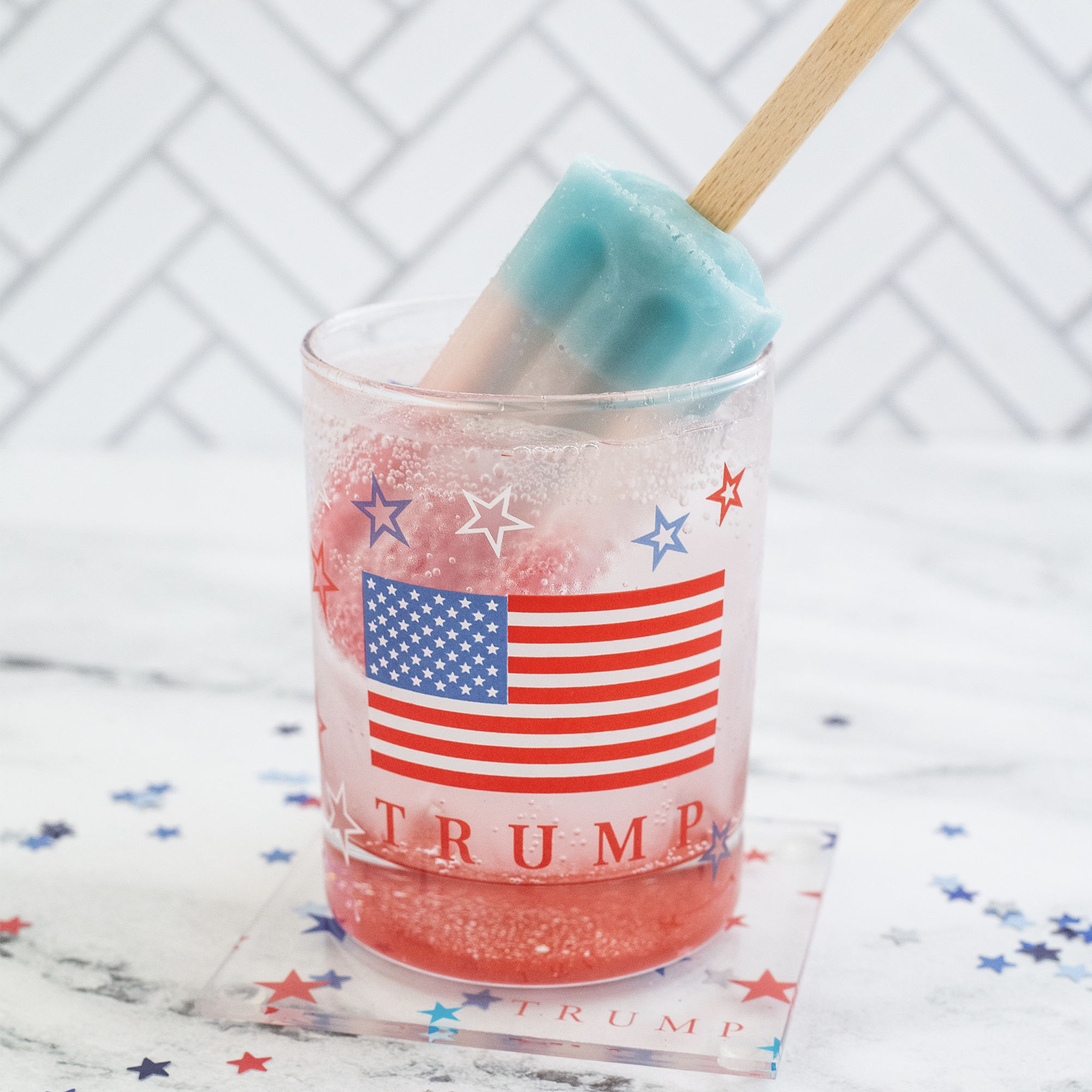Cheers to America with this high quality, made in the USA rocks glass. With custom painted TRUMP flag and sparkly stars, serve up your next drink, neat, on the rocks, and with a garnish of red, white, and blue!