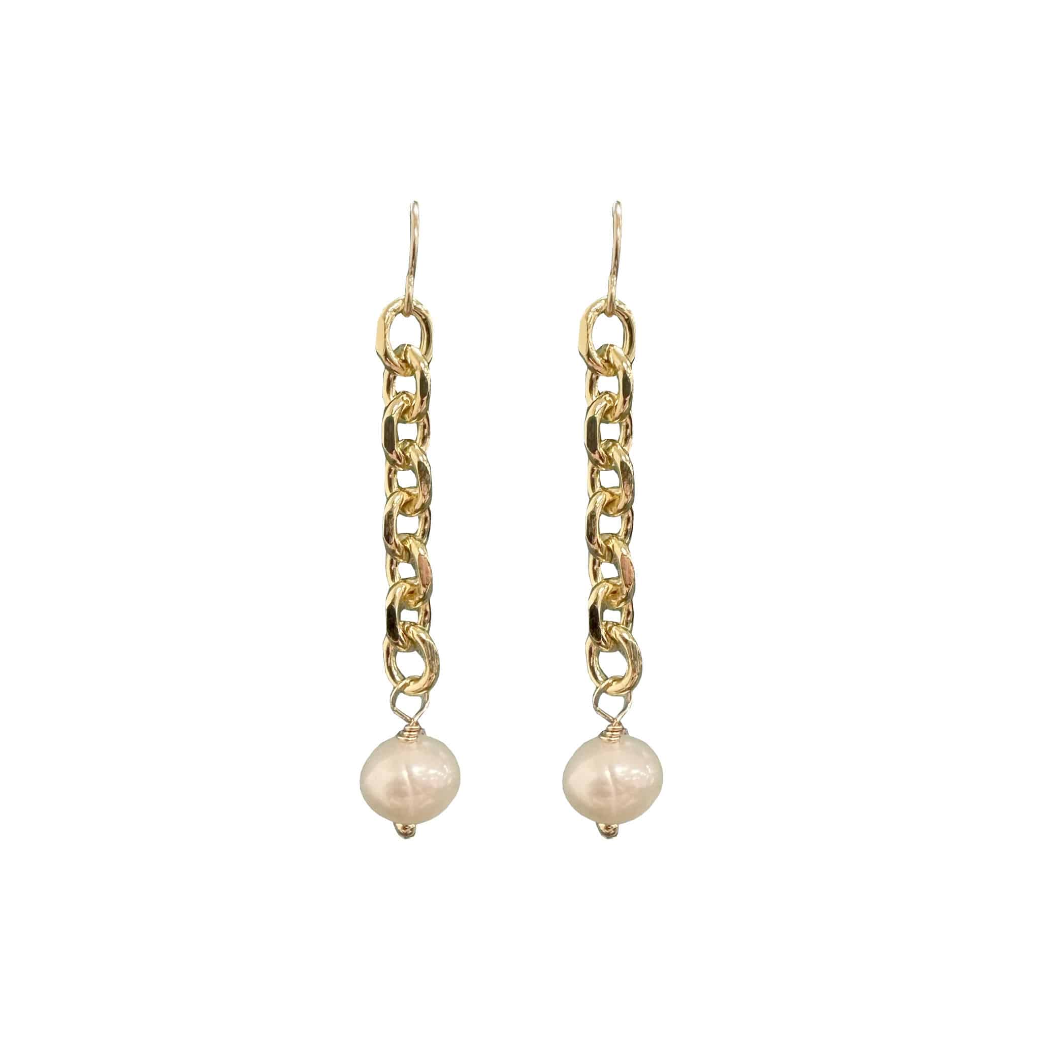 Pretty in pearls. The latest drop earring features an elevated gold chain drop earring with a freshwater pearl. Designed by Tracy Savage, an American jewelry artisan.