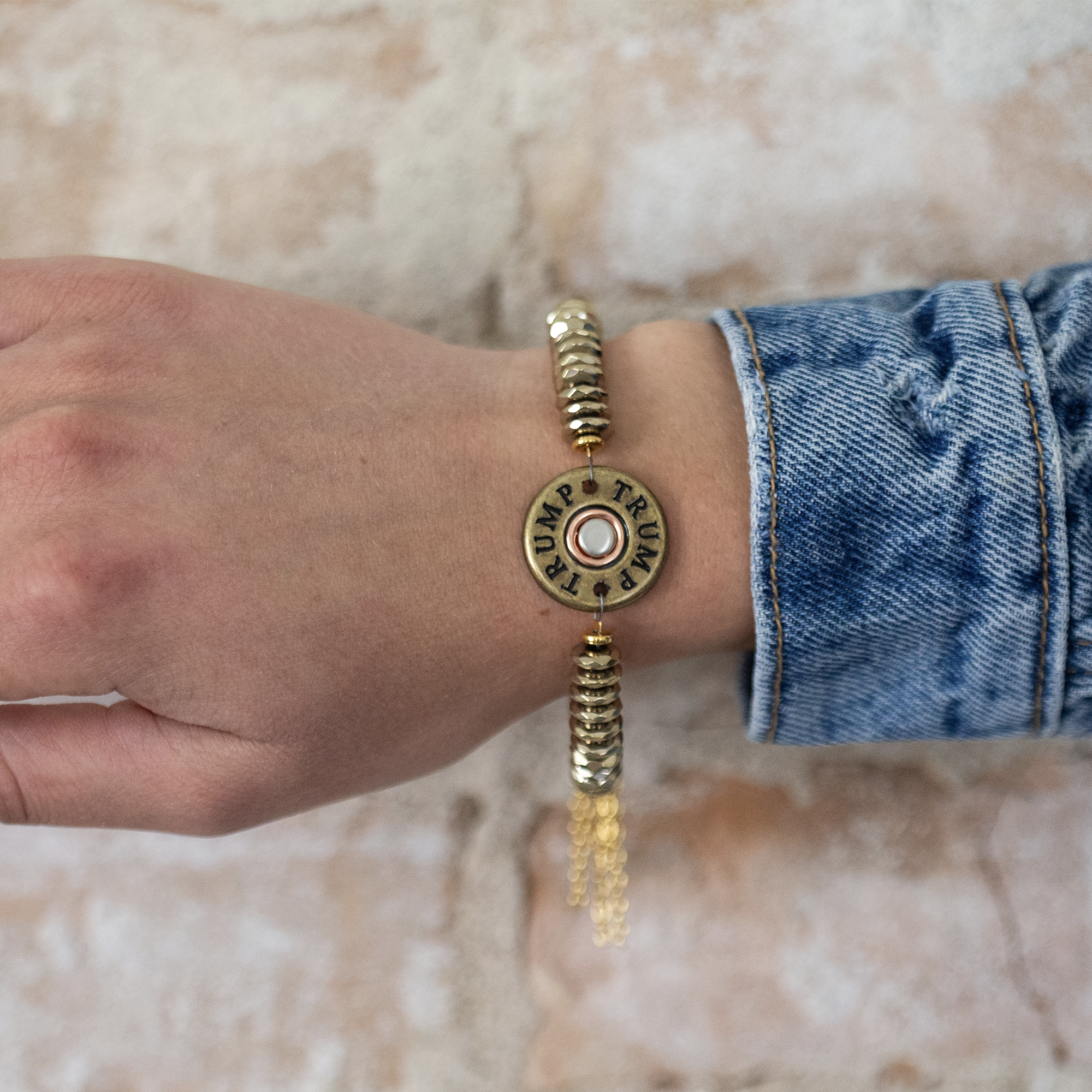 Gold beads and gold TRUMP concho shells never looked more stylish. A great gift for the lady in your life, add some TRUMP to her stack of arm candy this summer. Made in America.