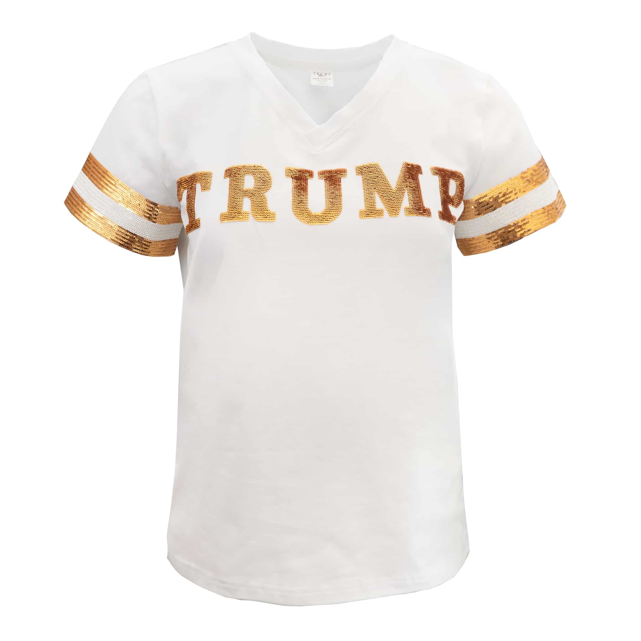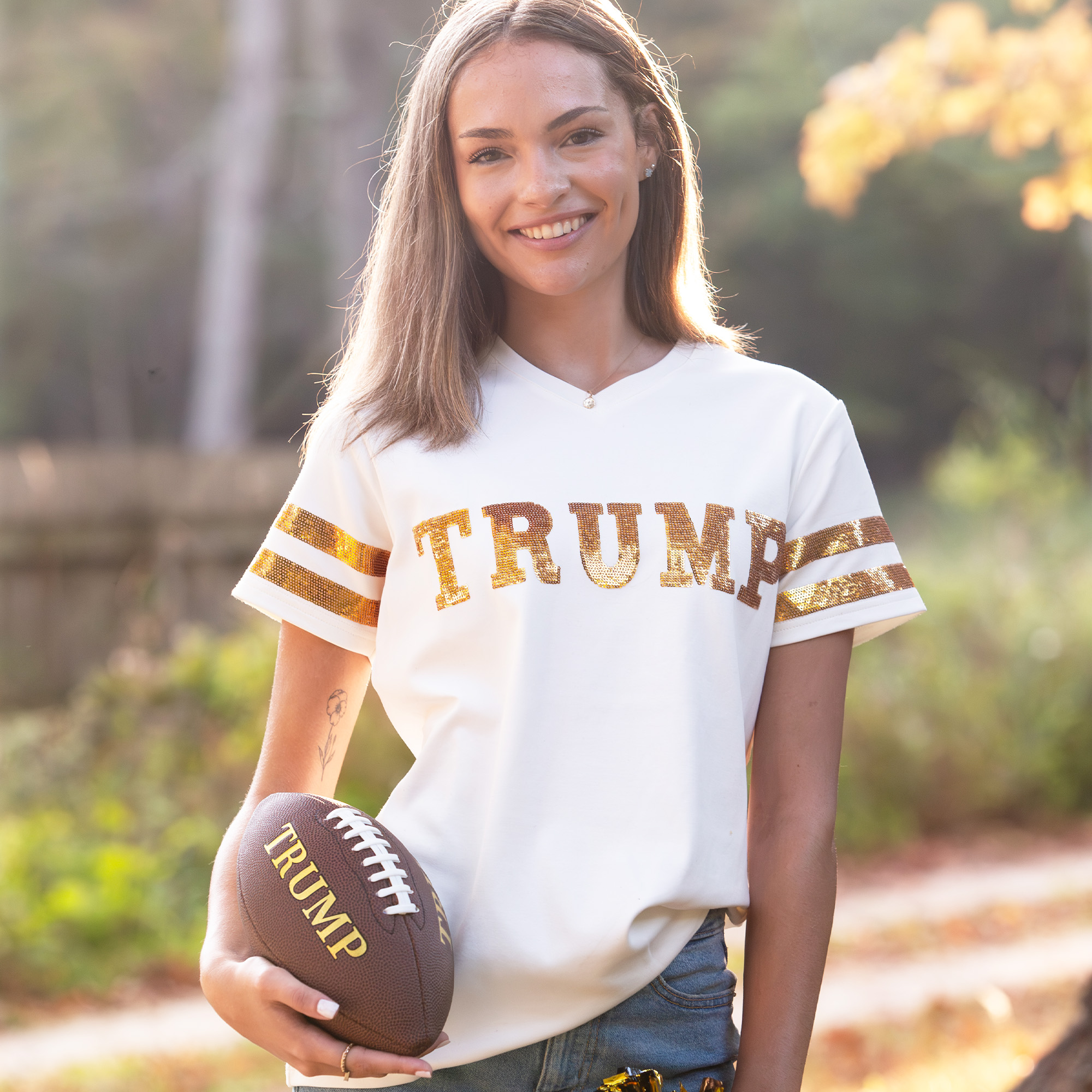 A spin on this Summer’s most popular tee – the Sequin Football Jersey Tee in Gold has a beautiful pop of glittery gold hand sewn on the sleeves, and the TRUMP logo across the chest. Perfectly paired with denim, this tee goes with anything.