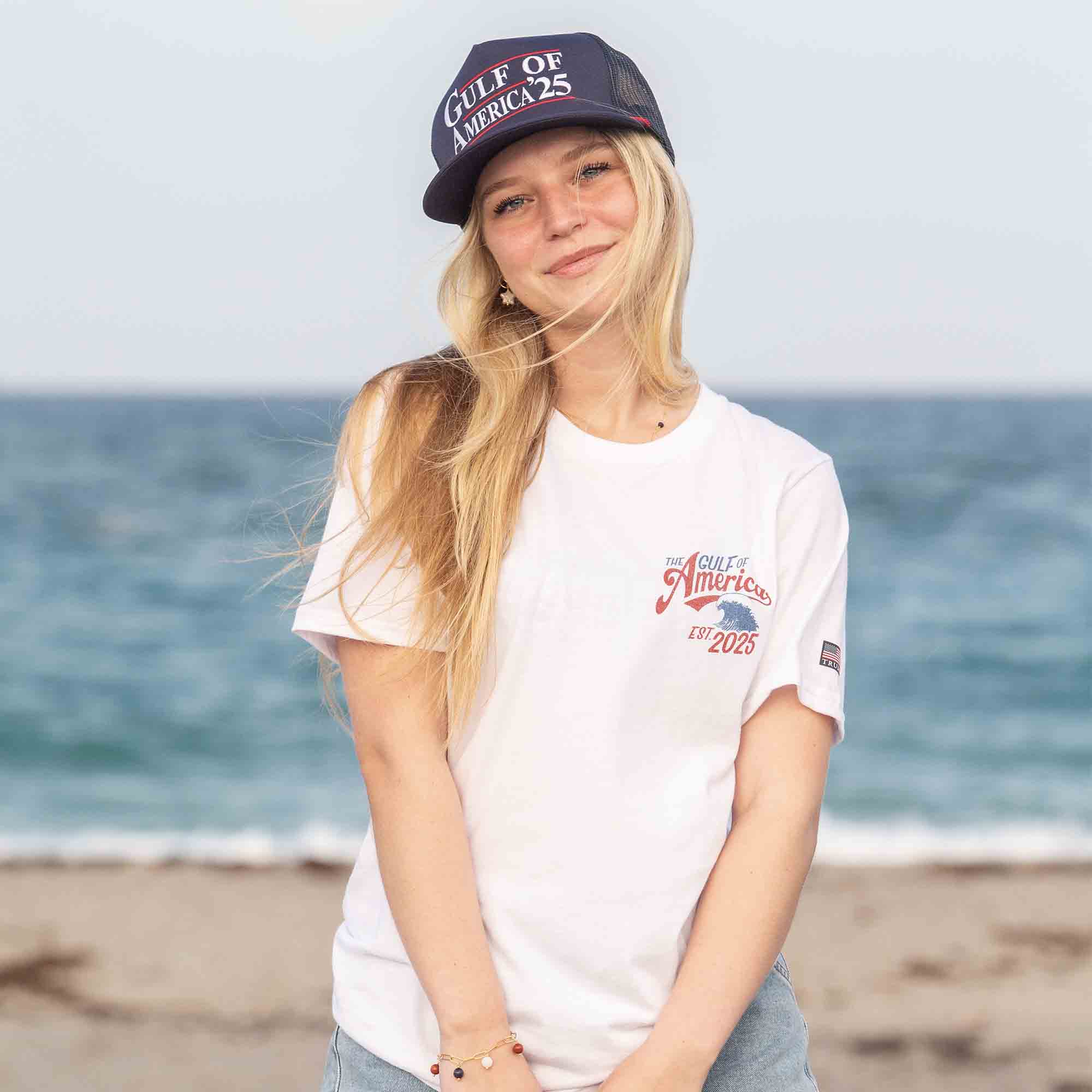 The Gulf of America Hat is now available in the classic Trump High Crown hat that has hosted the MAGA logo.