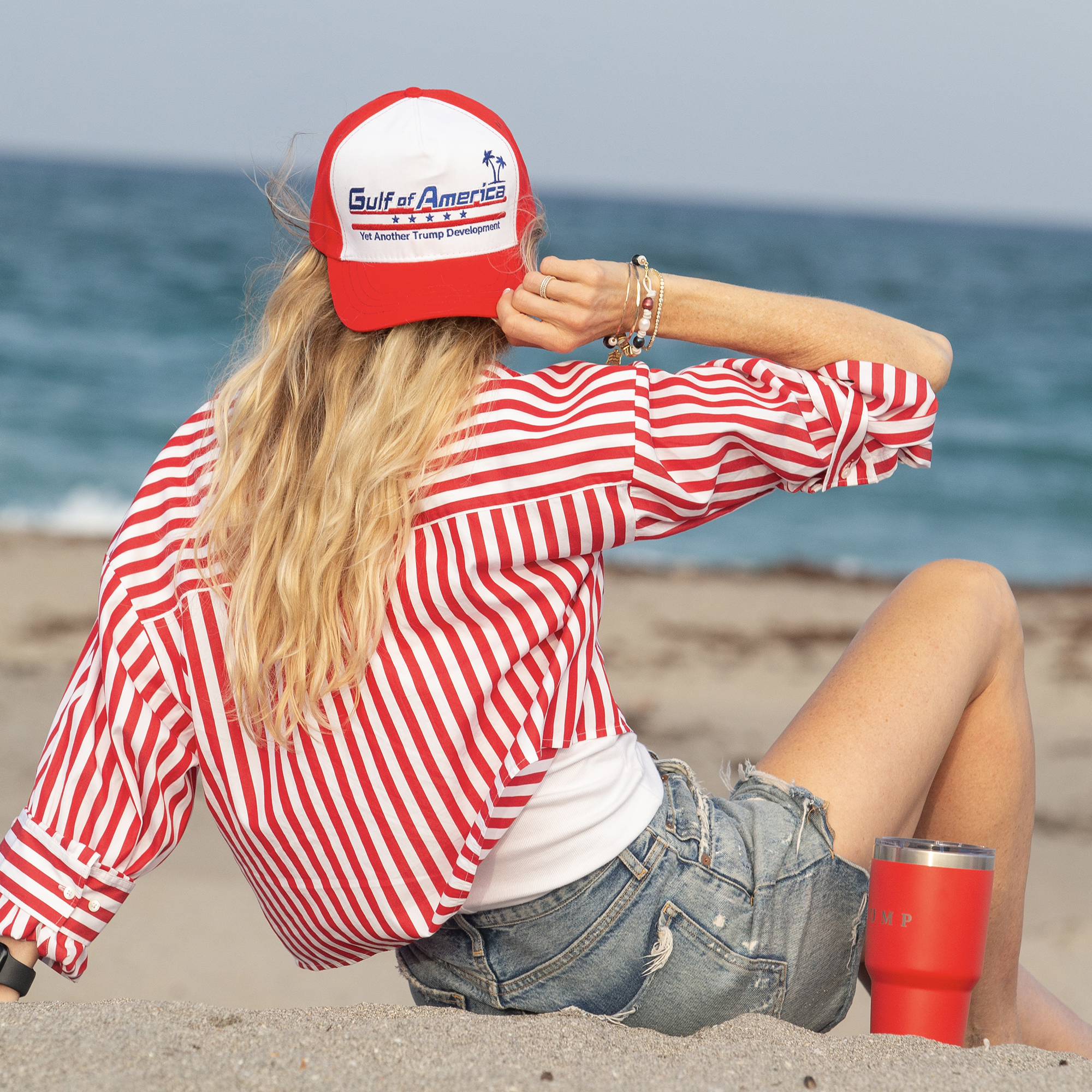 Yet another Trump development… this Gulf of America hat is soon to be your favorite. A playful twist on the original Make America Great Again hat, this red and white hat features a fully embroidered front.