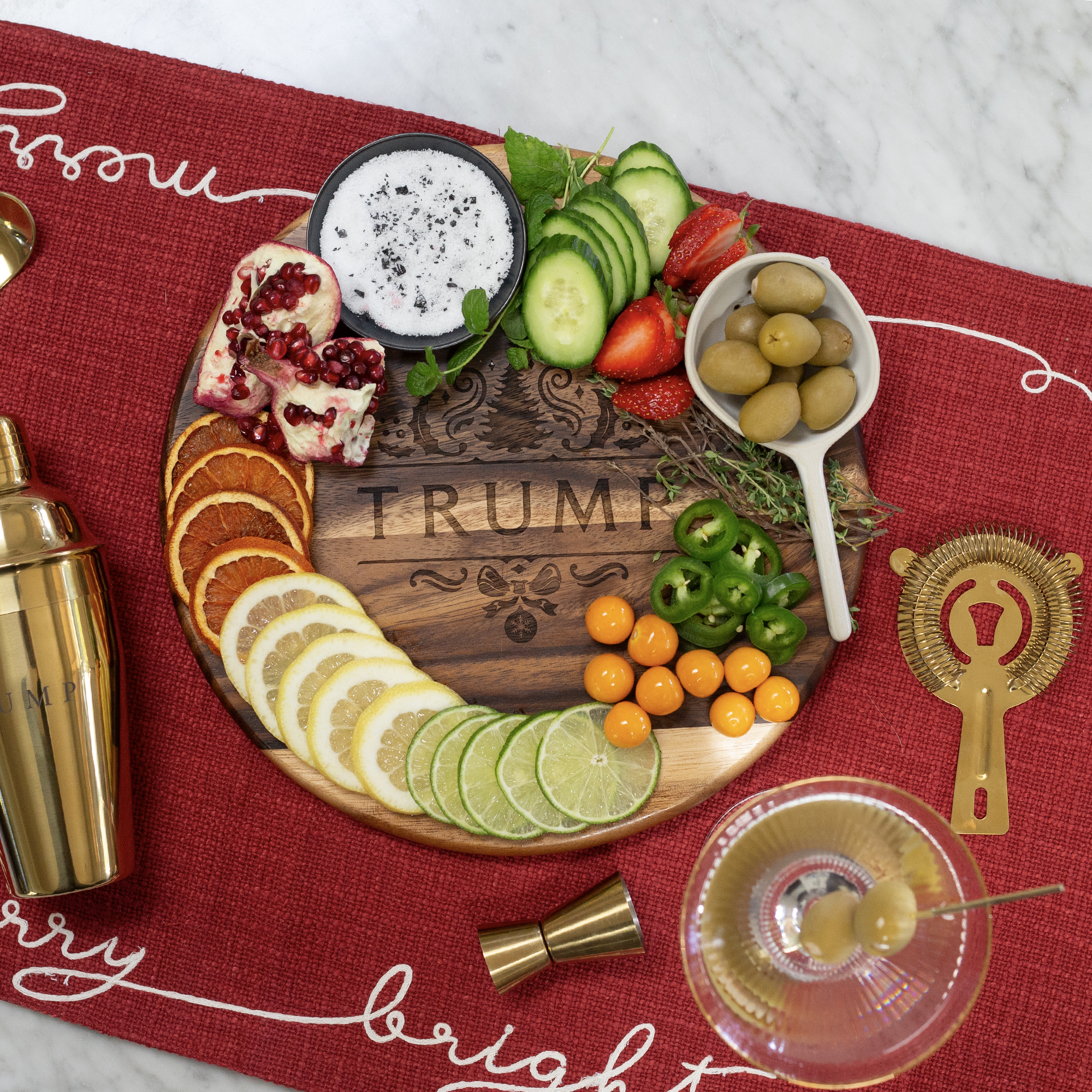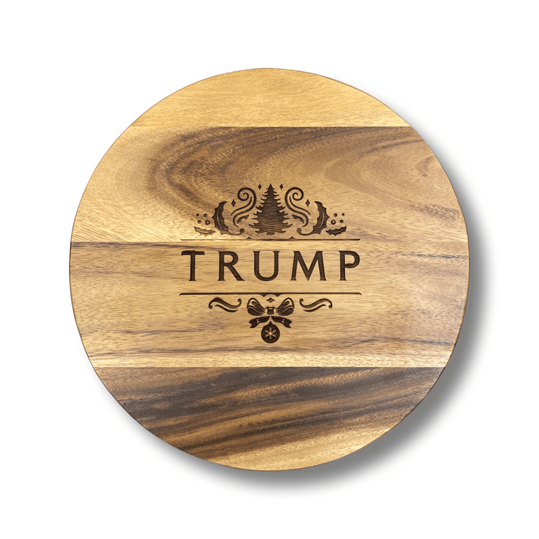 Host all of your Holiday parties in style with our Grand Acacia Round Board! Made with exceptional Acacia wood and accented by the carved exclusive Trump Holiday logo in the center, our elegant board is perfect for cutting, chopping, and serving alike.