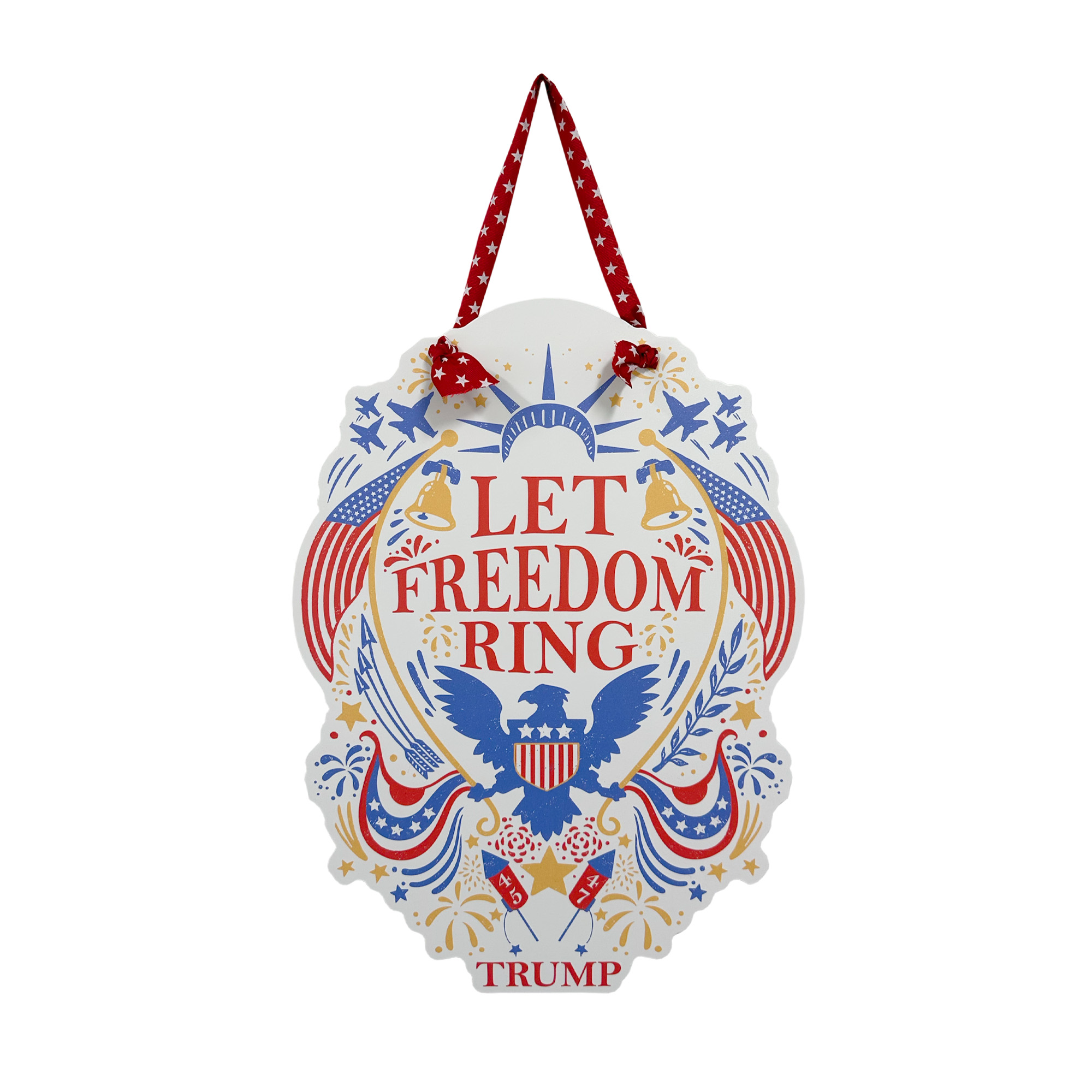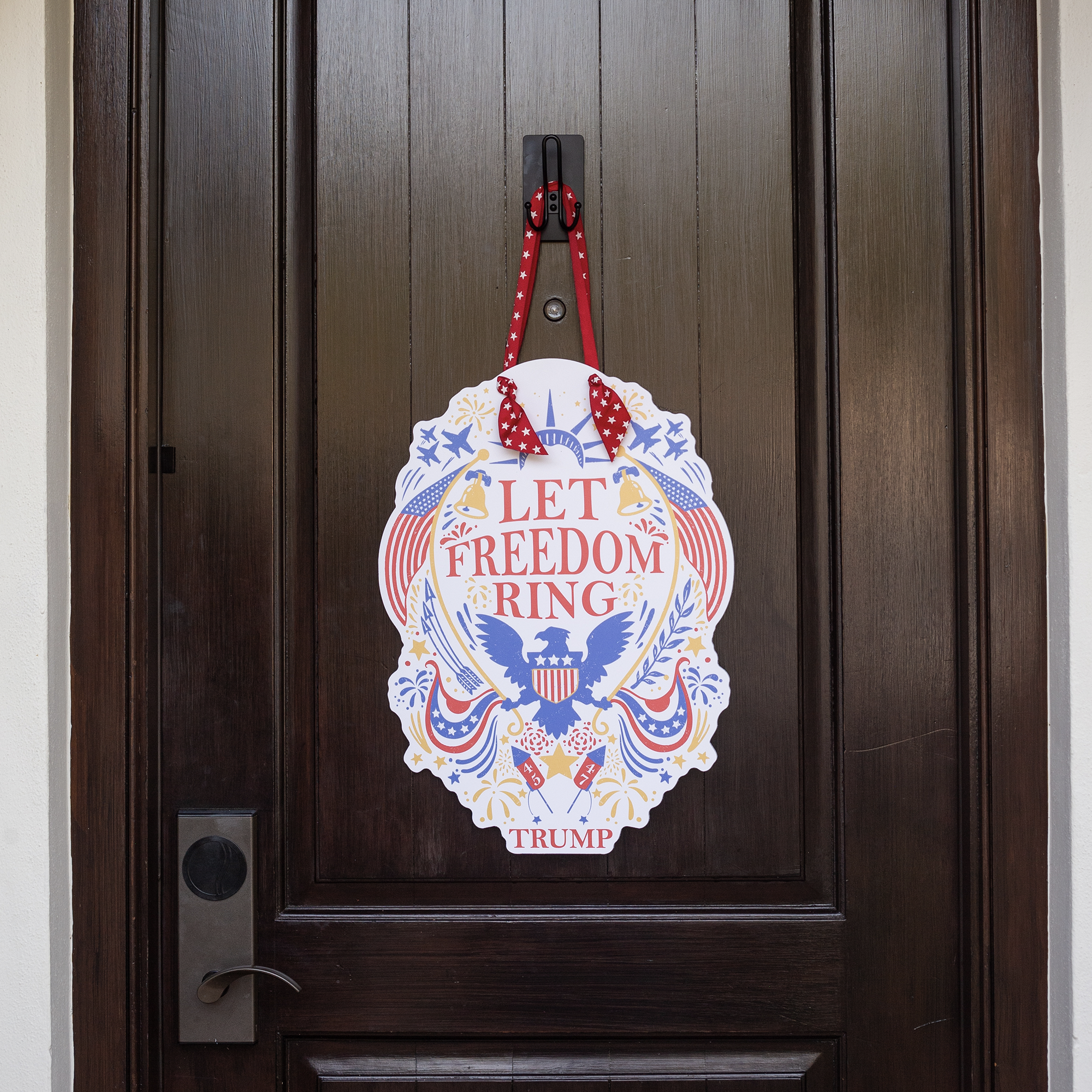 Show your patriotic spirit with our Let Freedom Ring door hanger. A timeless tribute to liberty and American pride. Crafted right here in the USA, this door hanger is perfect for adding a patriotic touch to your front door. Designed with bold, vibrant colors that stand out season after season.