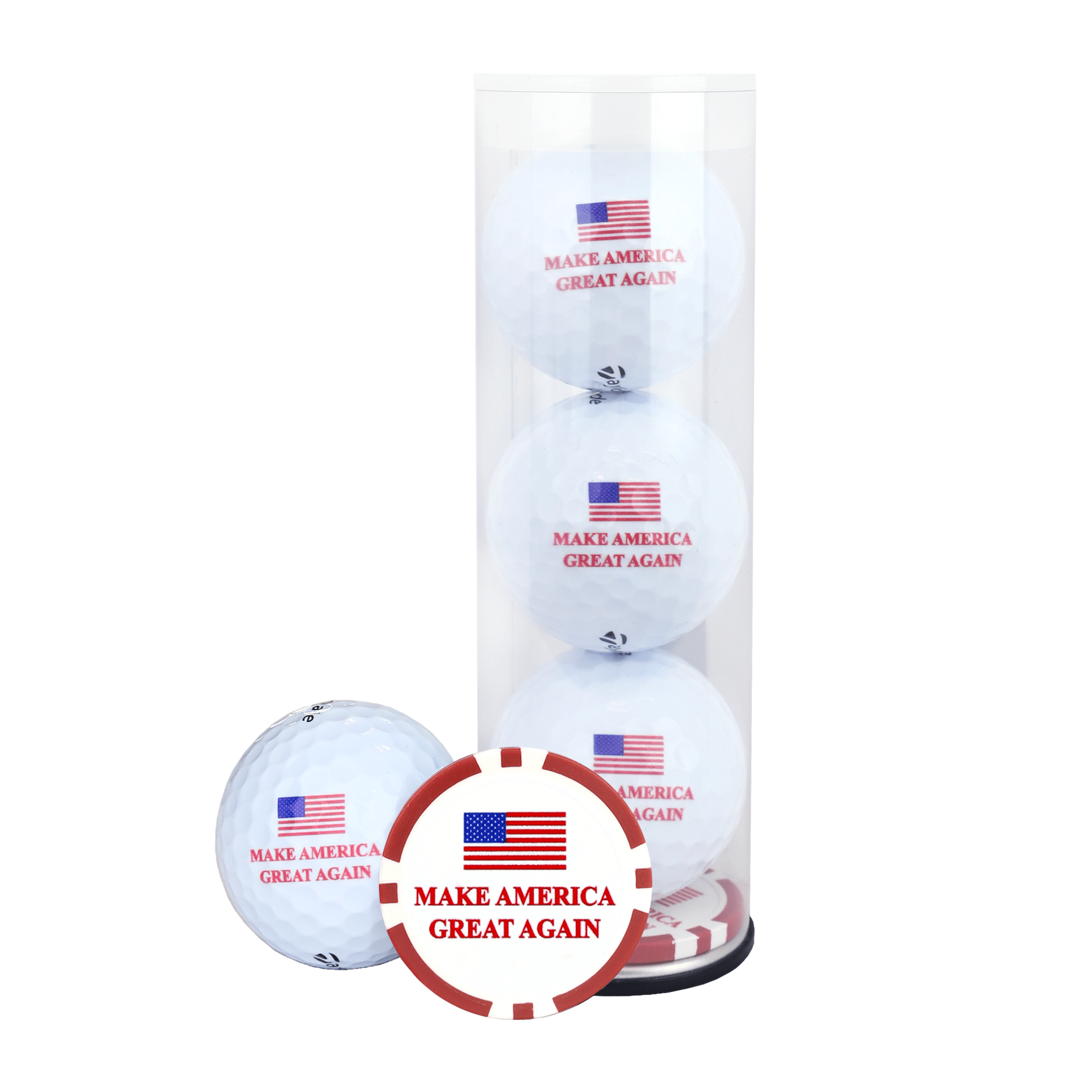 Play your best round and let your opponent know what team you are on with the MAGA golf ball set. Set contains three high quality golf balls and a Make America Great Again ball marker. This is a perfect gift for the golf enthusiast in your life.
