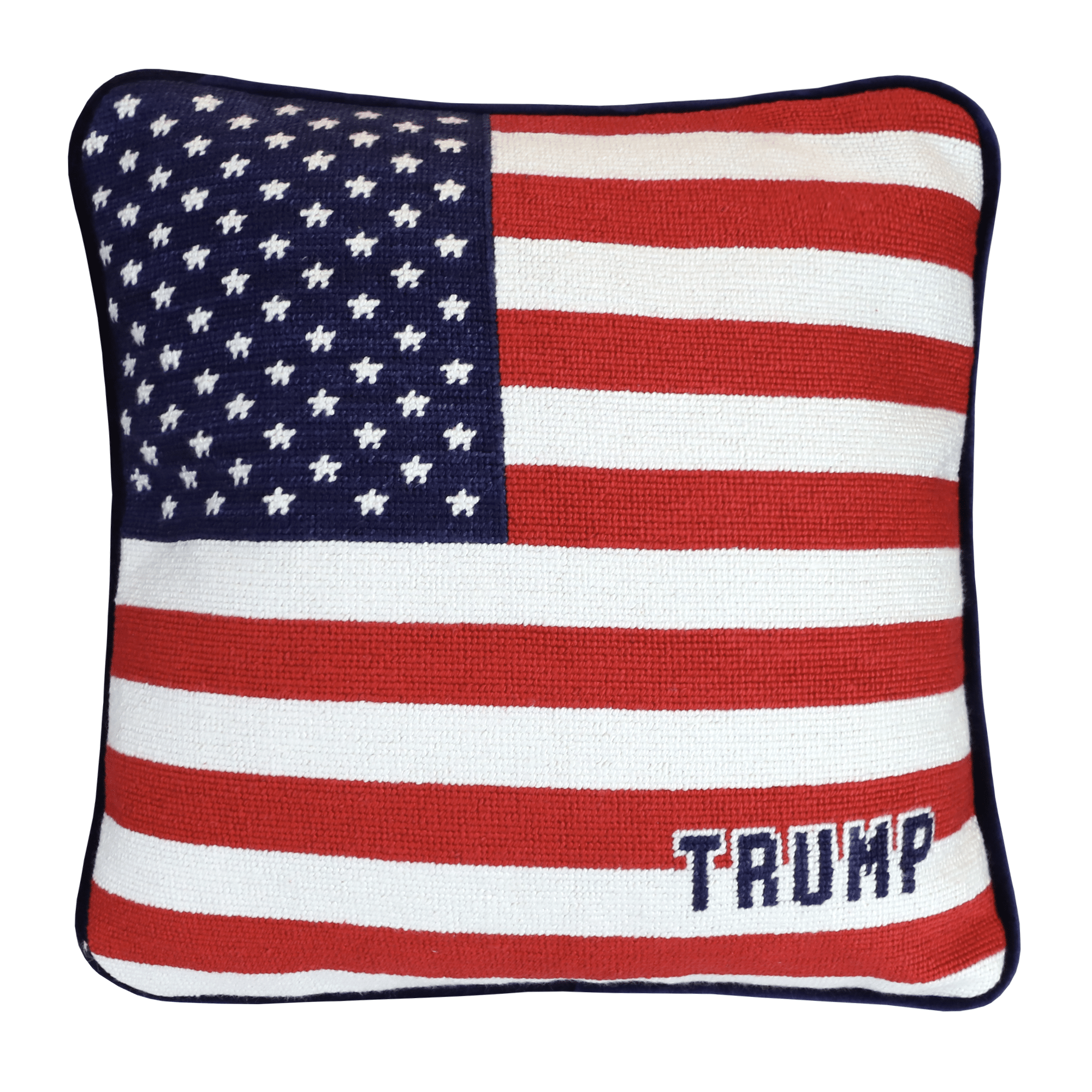 Designed by Smathers and Branson, the leaders in needlepoint, this high quality throw pillow is the perfect accent to any office seating or home life. In a sea of throw pillows, this one will be sure to stand out! American flag with TRUMP logo.
