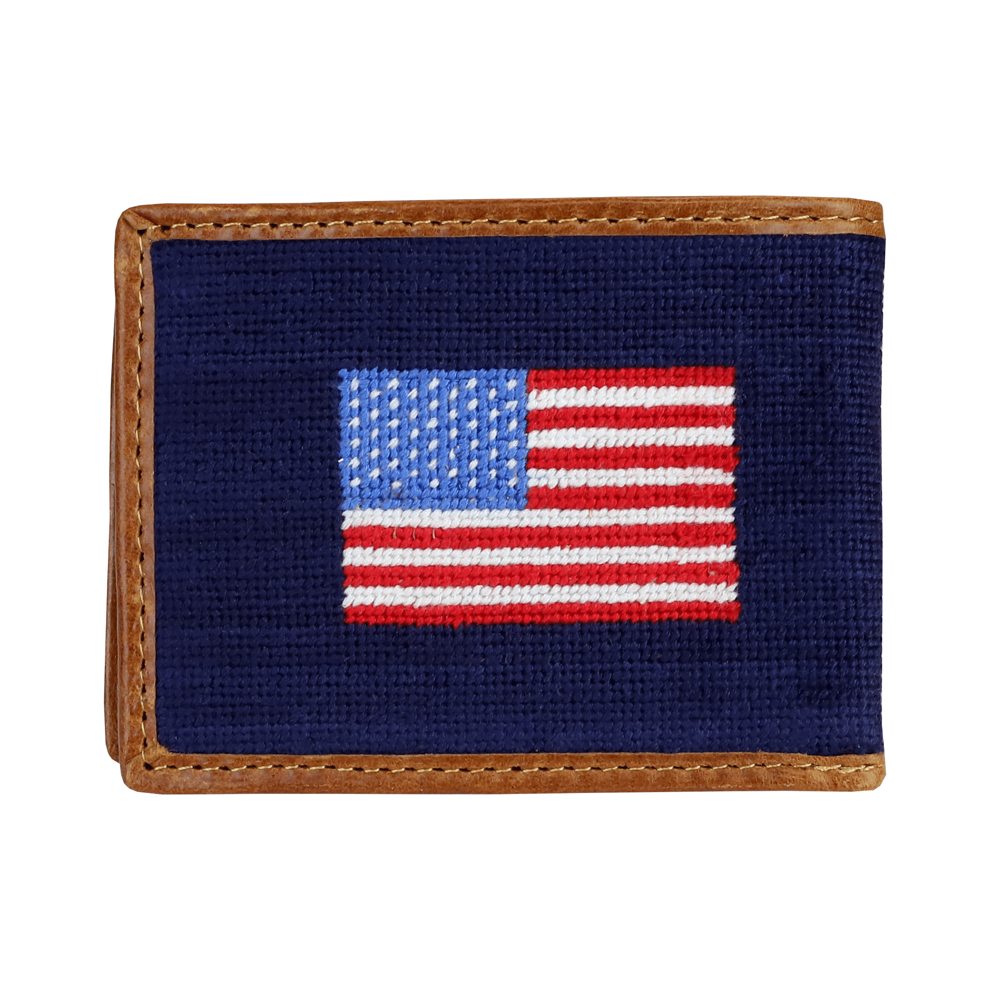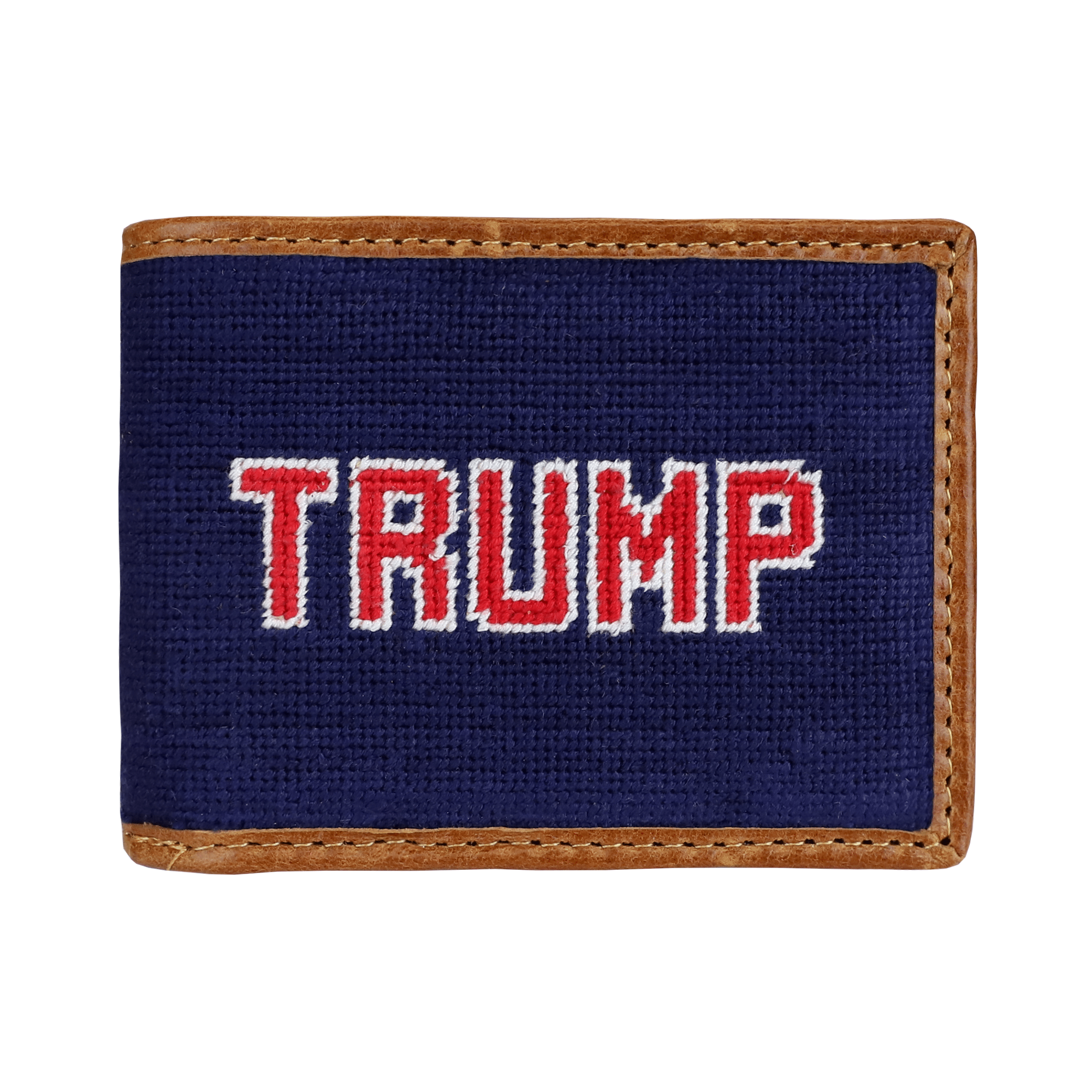 Keep your cash in one place with the slim line look and feel of a classic needlepoint wallet. Handstitched, and featuring high quality leather lining, this wallet will age nicely with use. USA flag on one side, TRUMP logo on the other.