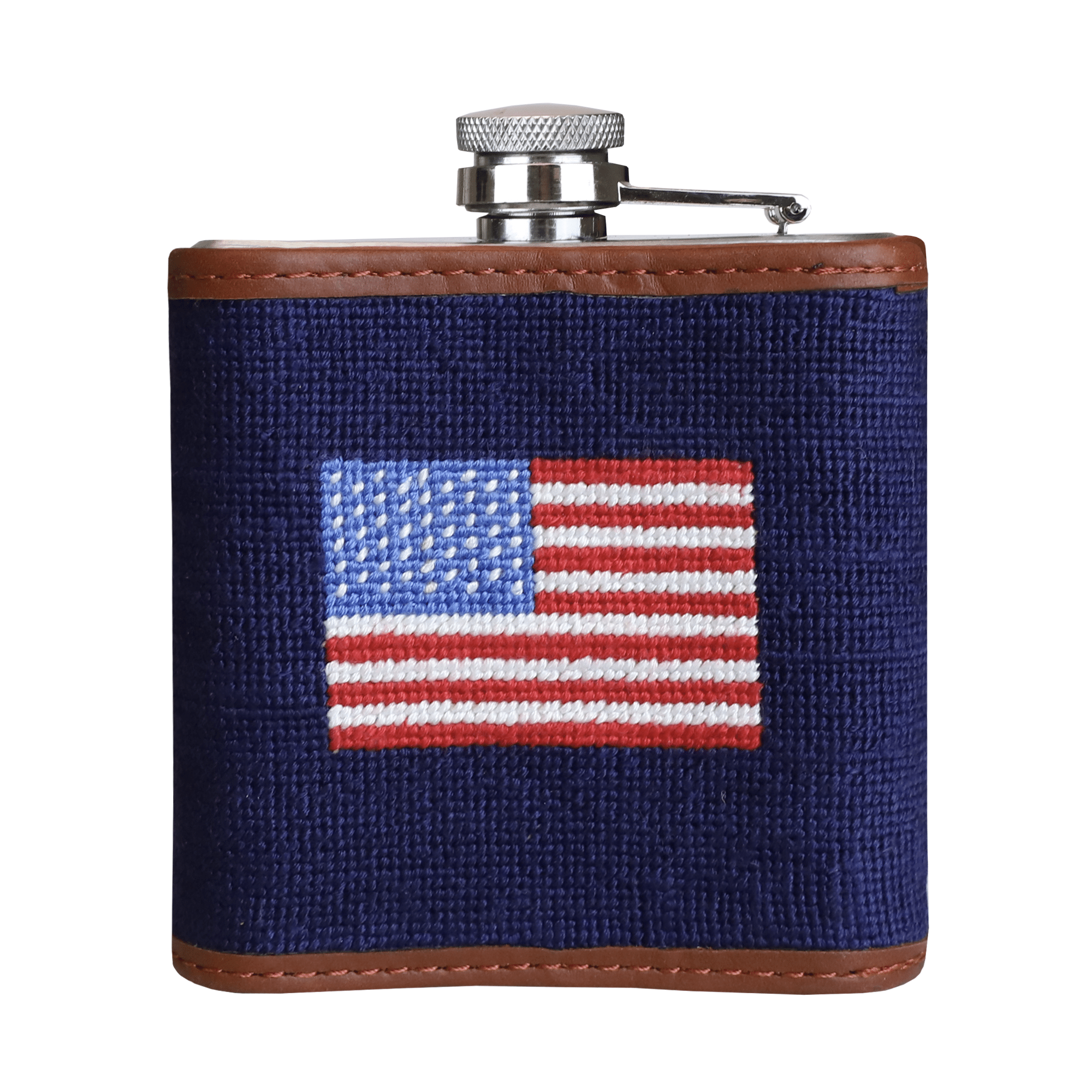 Take the party with you with this upscale hand-stitched needlepoint flask. Bound with a combination of highest quality leather, and the craftsmanship of needlepoint, cheers to America in style!