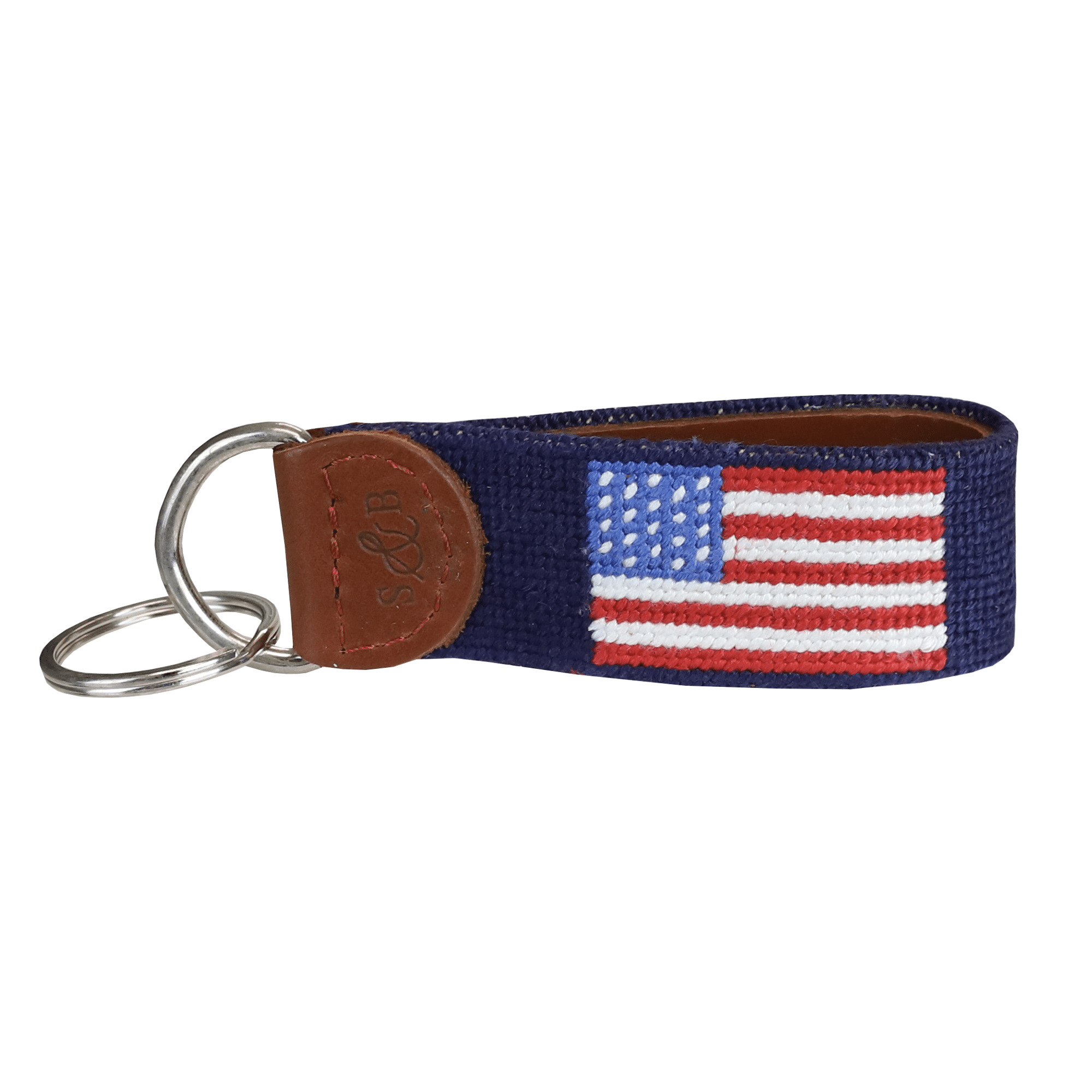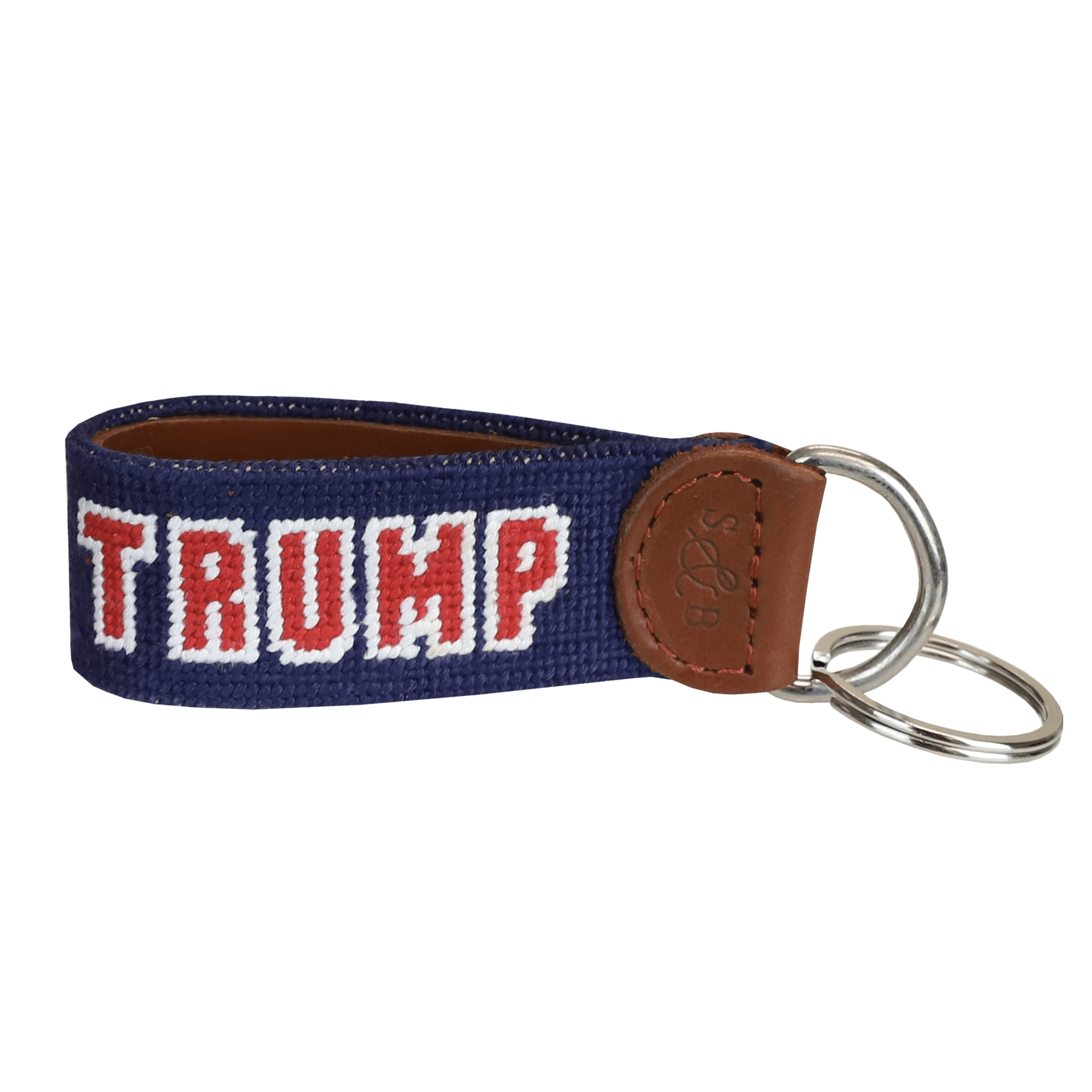 Unlock your life with this Americana inspired key fob. 100% hand-stitched needlepoint and trimmed in the finest Italian leather, this key chain will hold up to whatever your daily life has in store and keeps all your keys organized in style. TRUMP Logo and Flag.