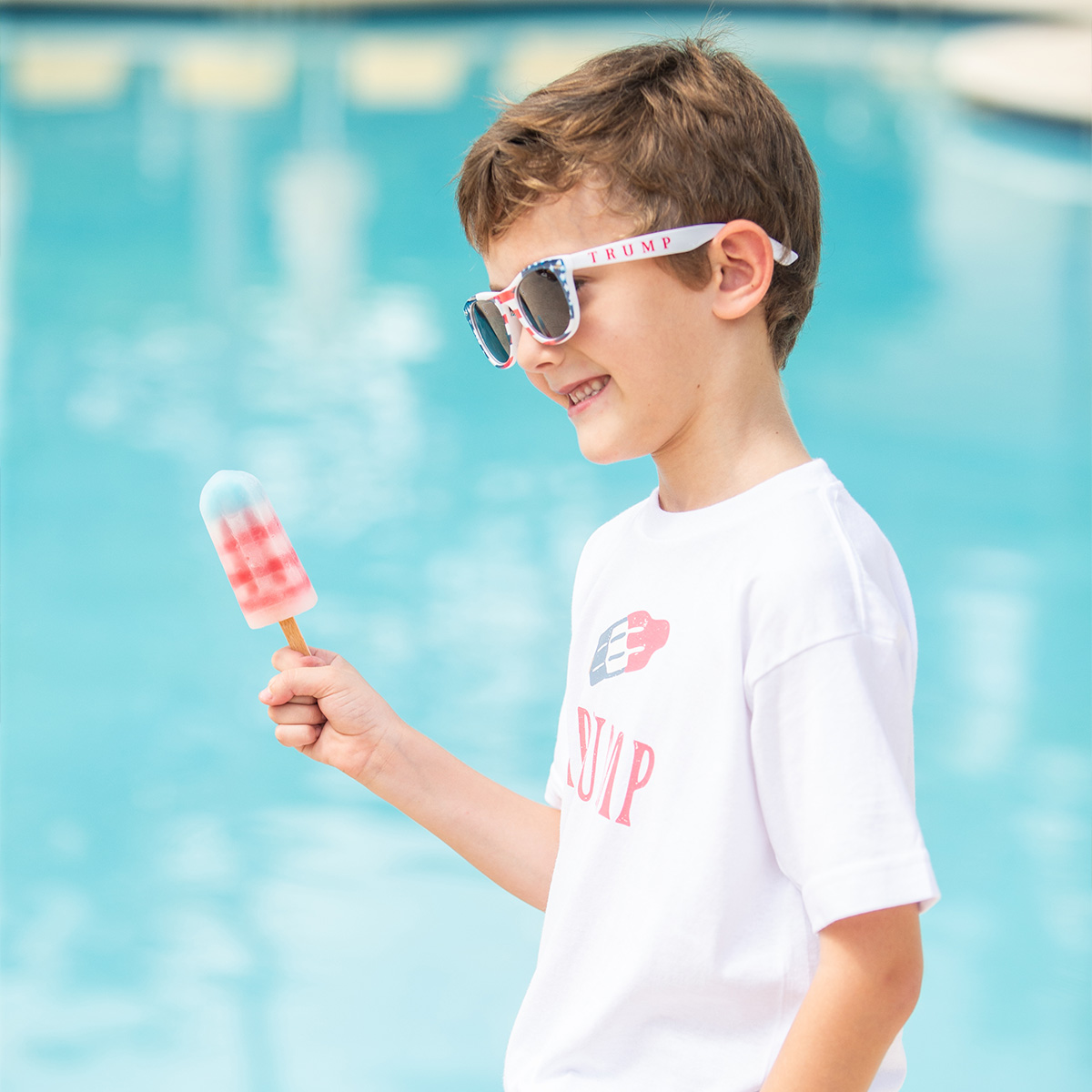 Inspired by the classic styling of one of the most iconic sunglasses around, these fun USA themed glasses are perfect for sunny days at the beach, cruising around town with the top down, and hitting a lively outdoor happy hour. Pick up a few pairs today because we know your friends and family are going to casually be borrowing them! Features TRUMP logo on right temple.