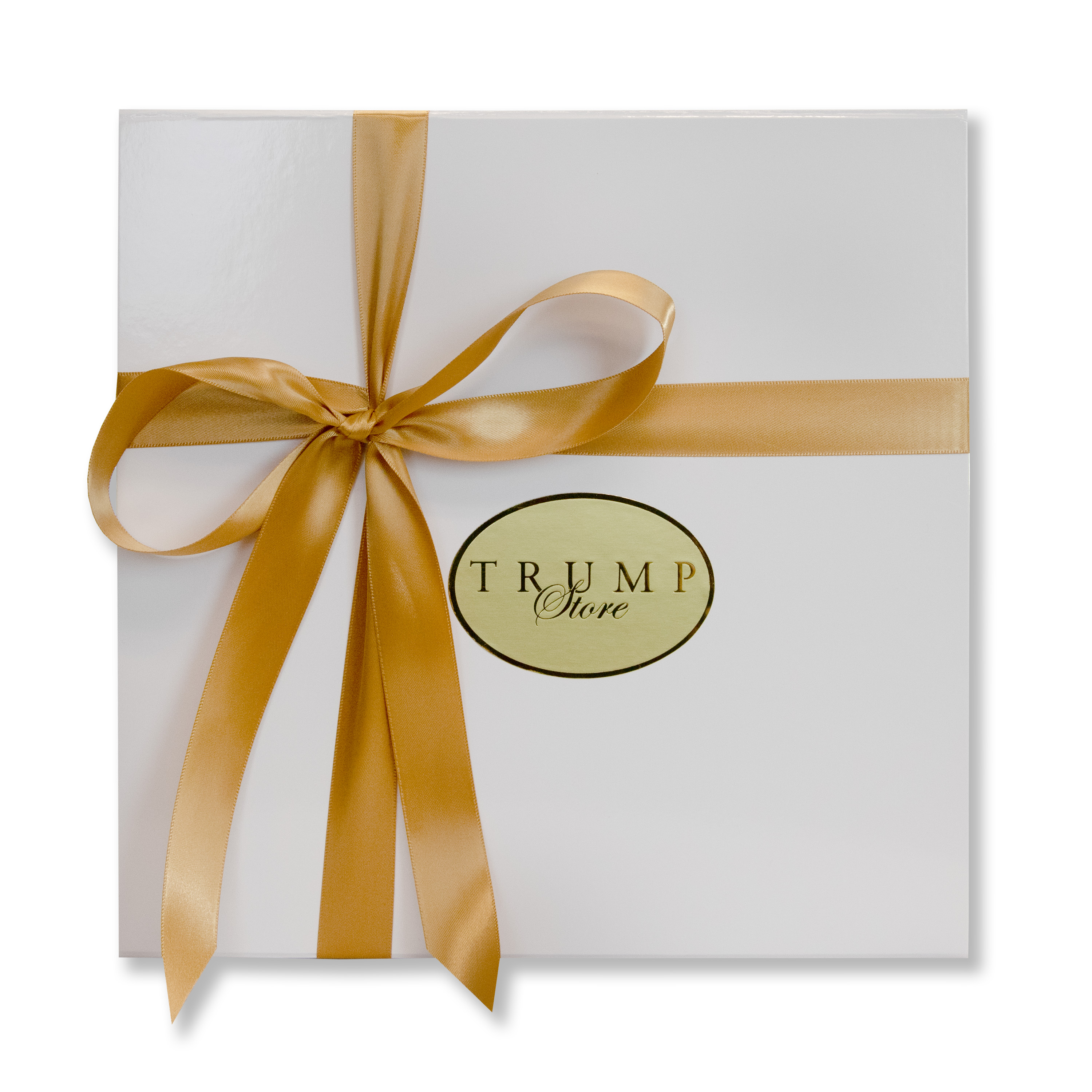 - Exclusive Trump Store gift wrapping: White Trump Store magnetic close box, gold tissue paper, and gold ribbon