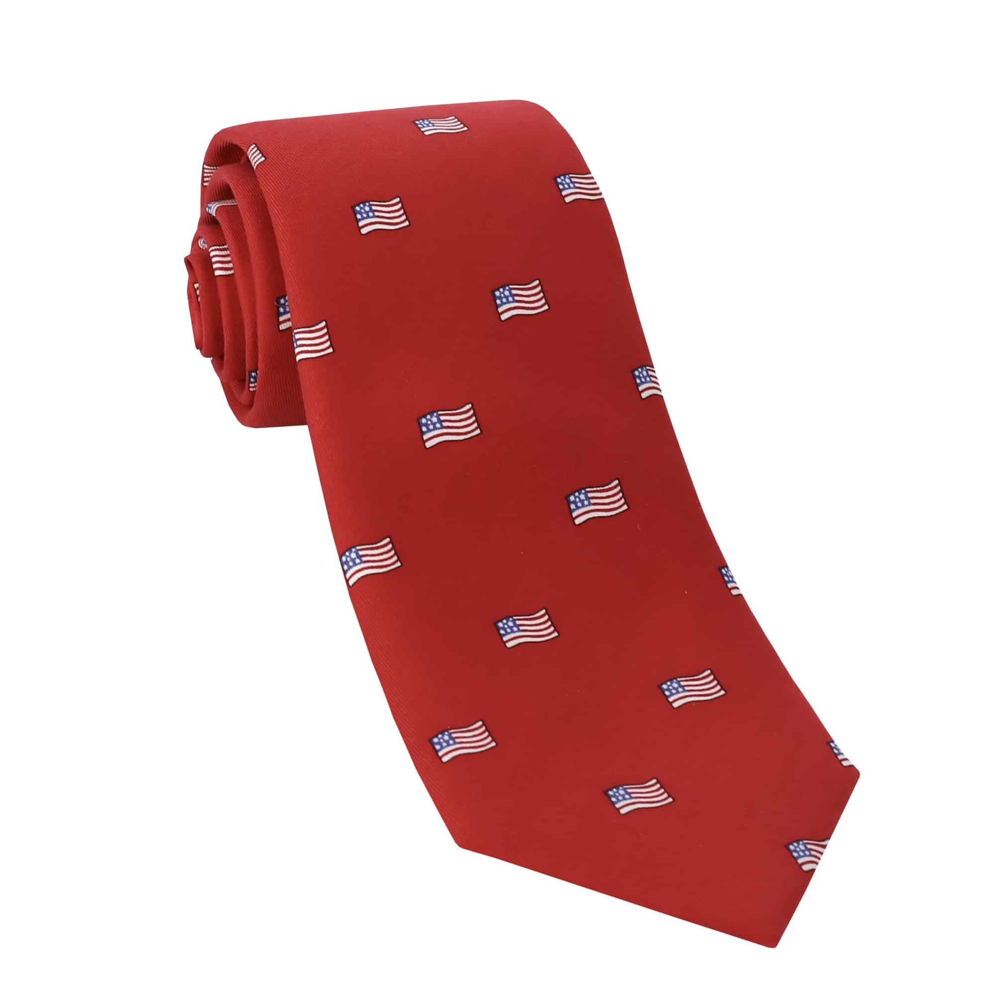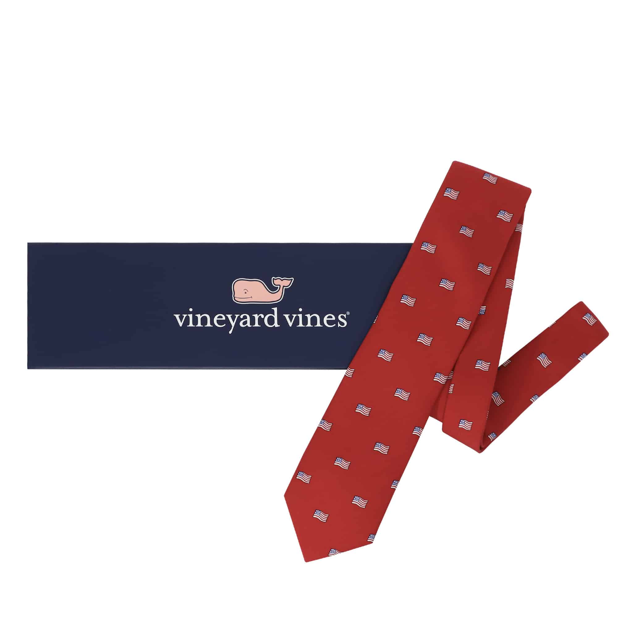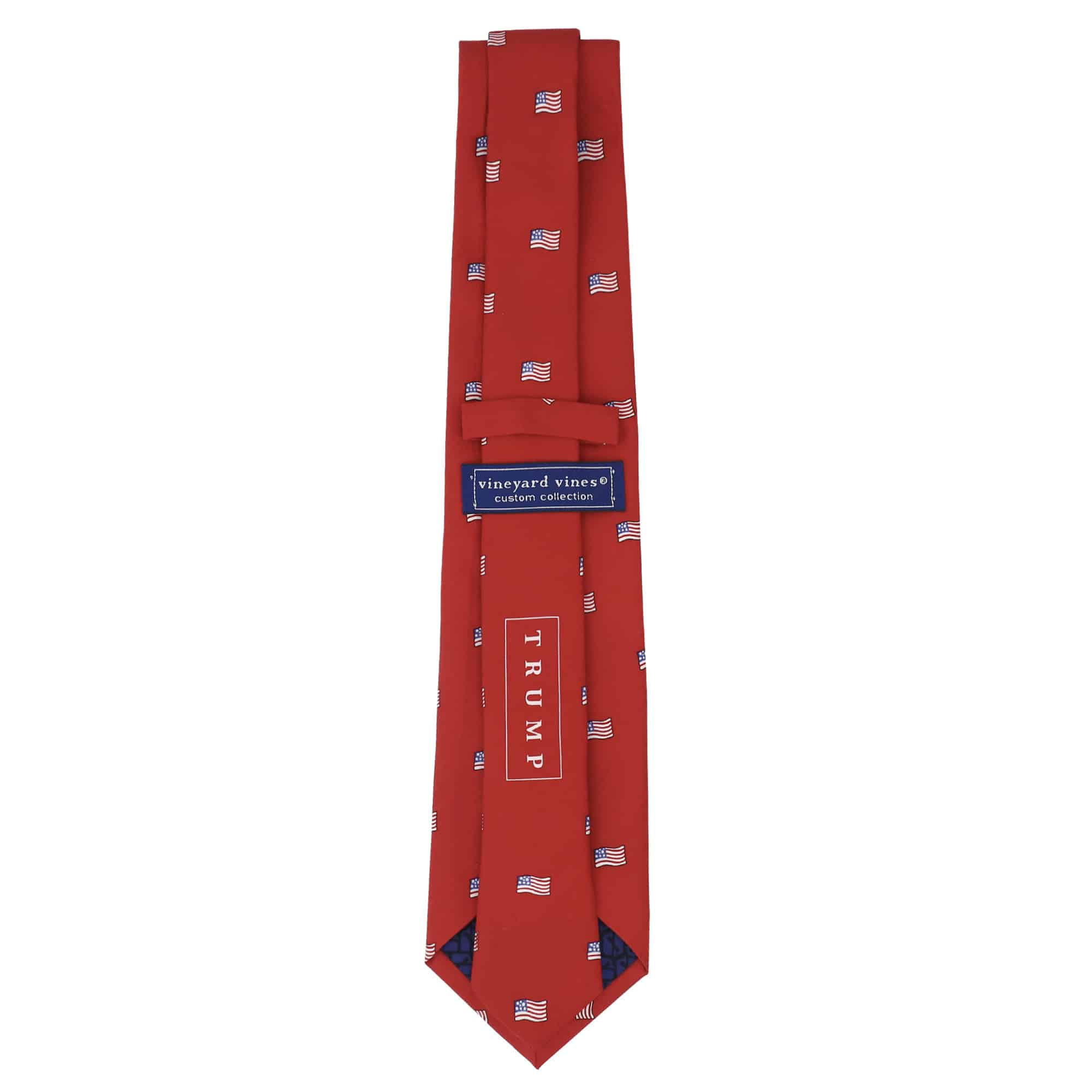 The perfect companion to that classic navy suit, this silk tie features an equally classic pattern of American flags. Designed and produced by Vineyard Vines of the highest quality silk necktie material, it is perfect for any occasion where you want to show your patriotism and love for our country. Features TRUMP signature logo on the keeper loop. Also available in navy.