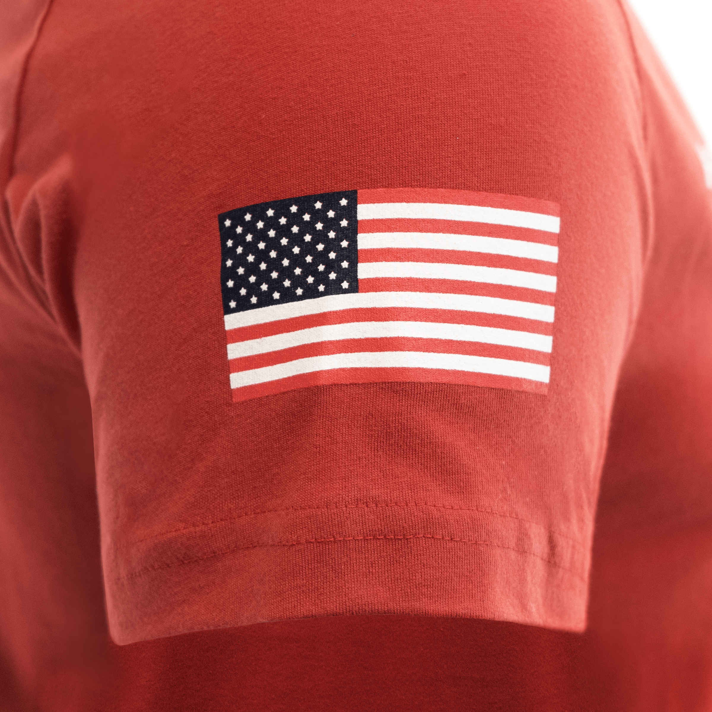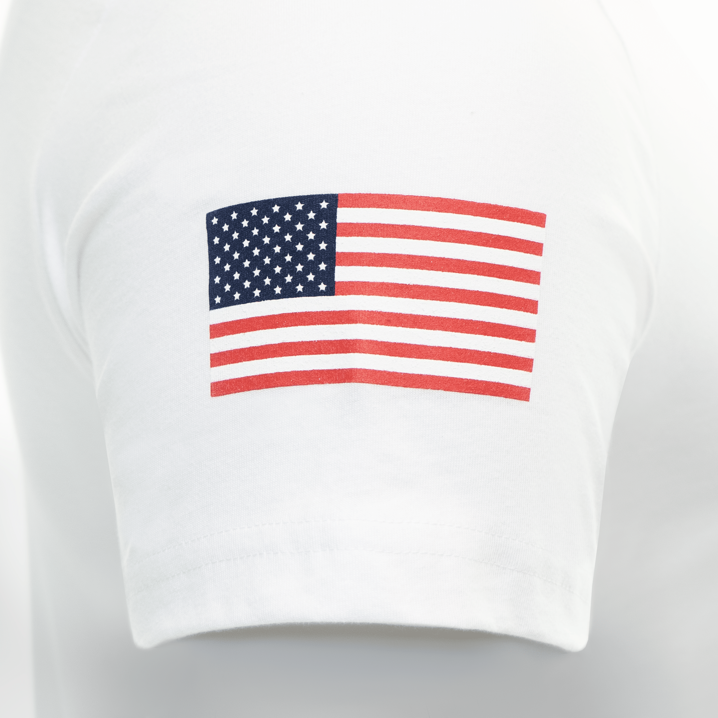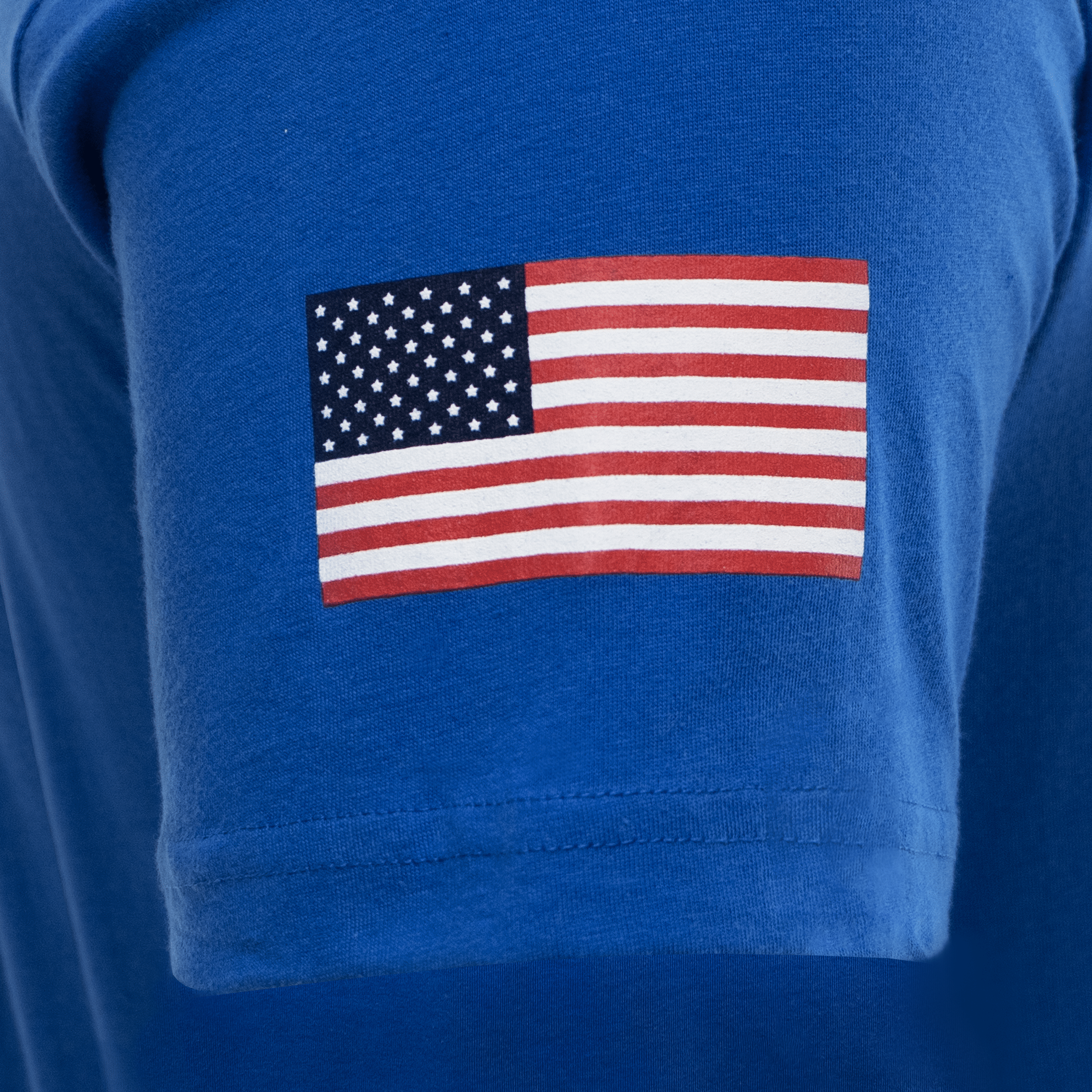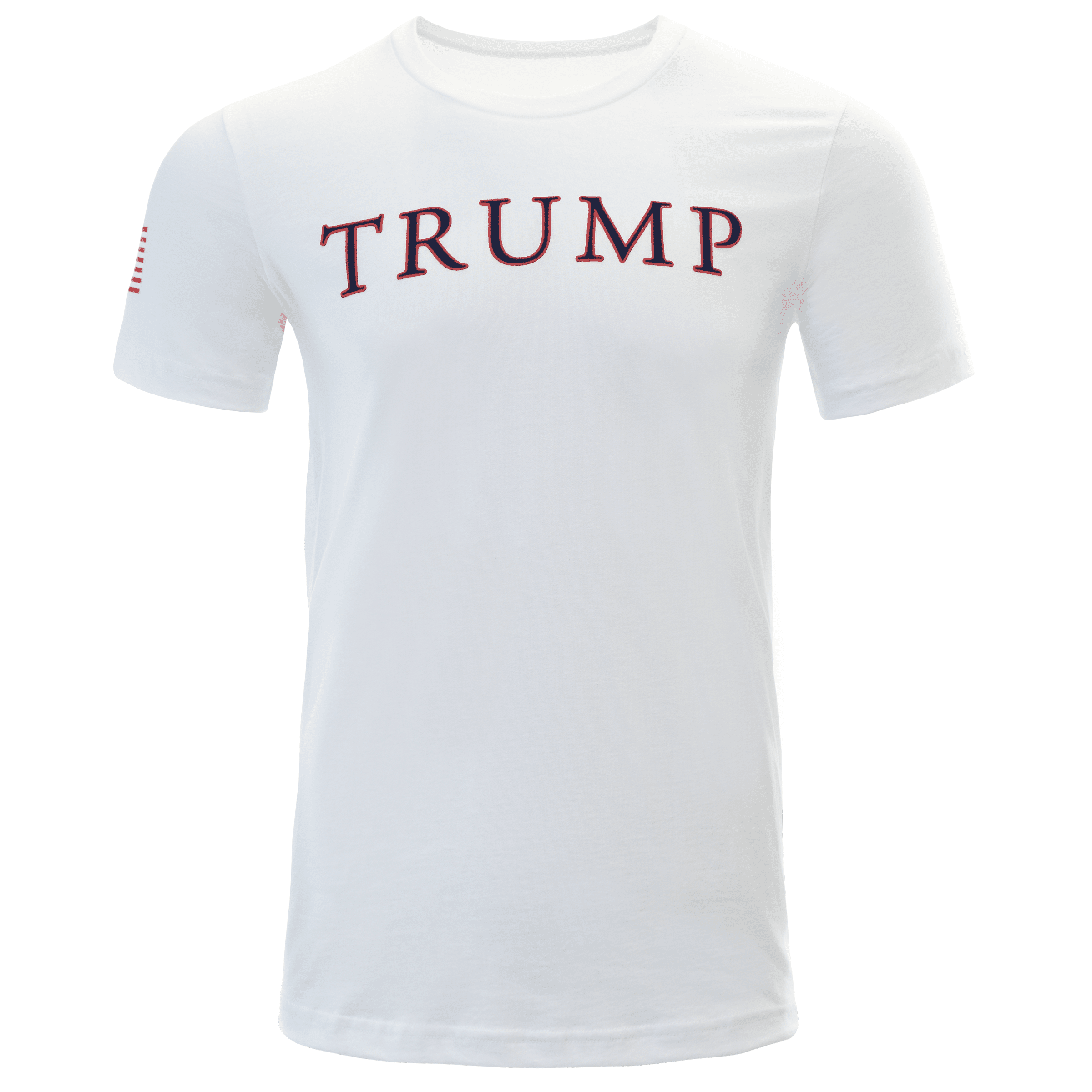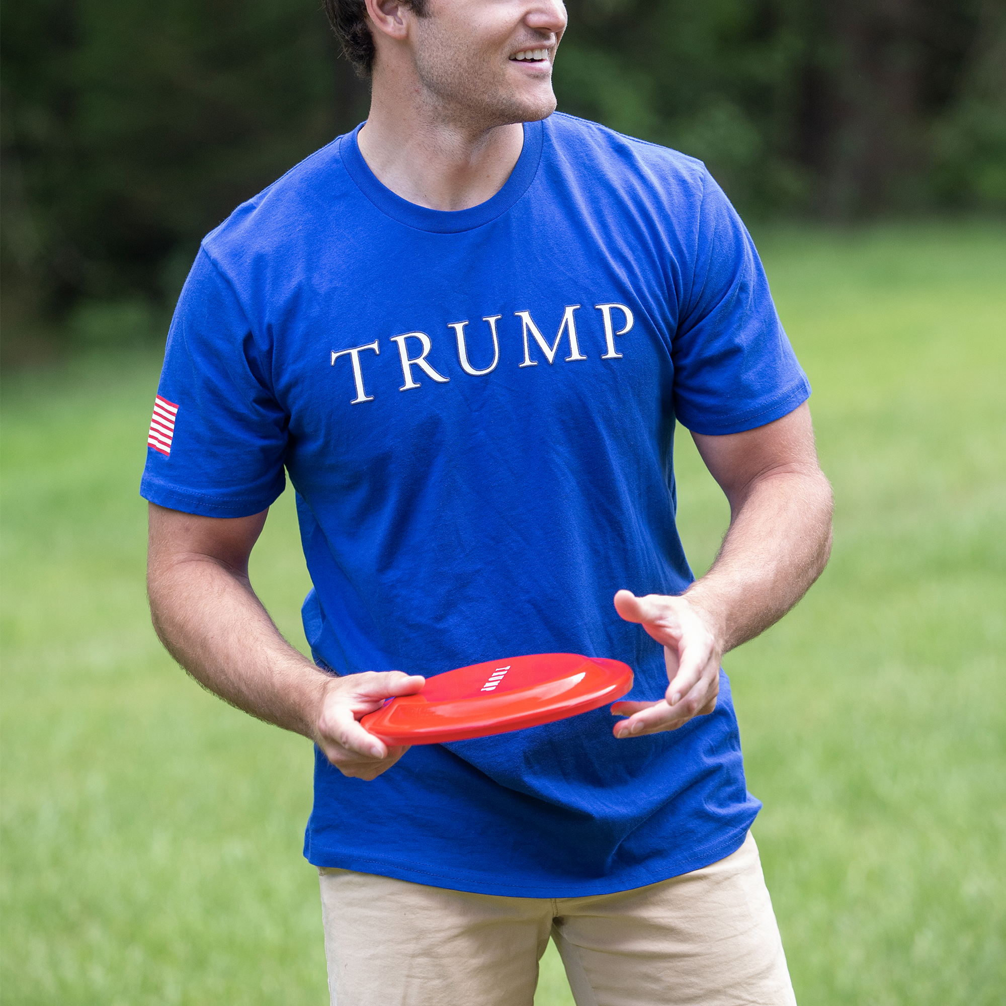 When simple says more. A solid blue cotton blend tee, made in America and with the straightforward TRUMP message across the front and flag print across the right sleeve, you will reach for this over and over again. Unisex.