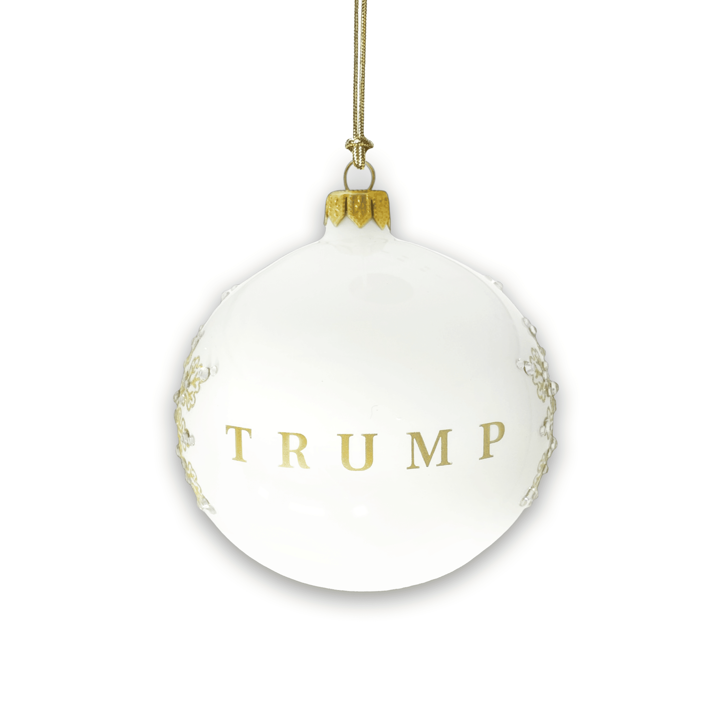 This magical, glittery Trump snowflake round ball ornament will be the center of attention on your tree this season. With stunning gold sparkle details on an intricate hand painted snowflake, this ornament features TRUMP front and center.
