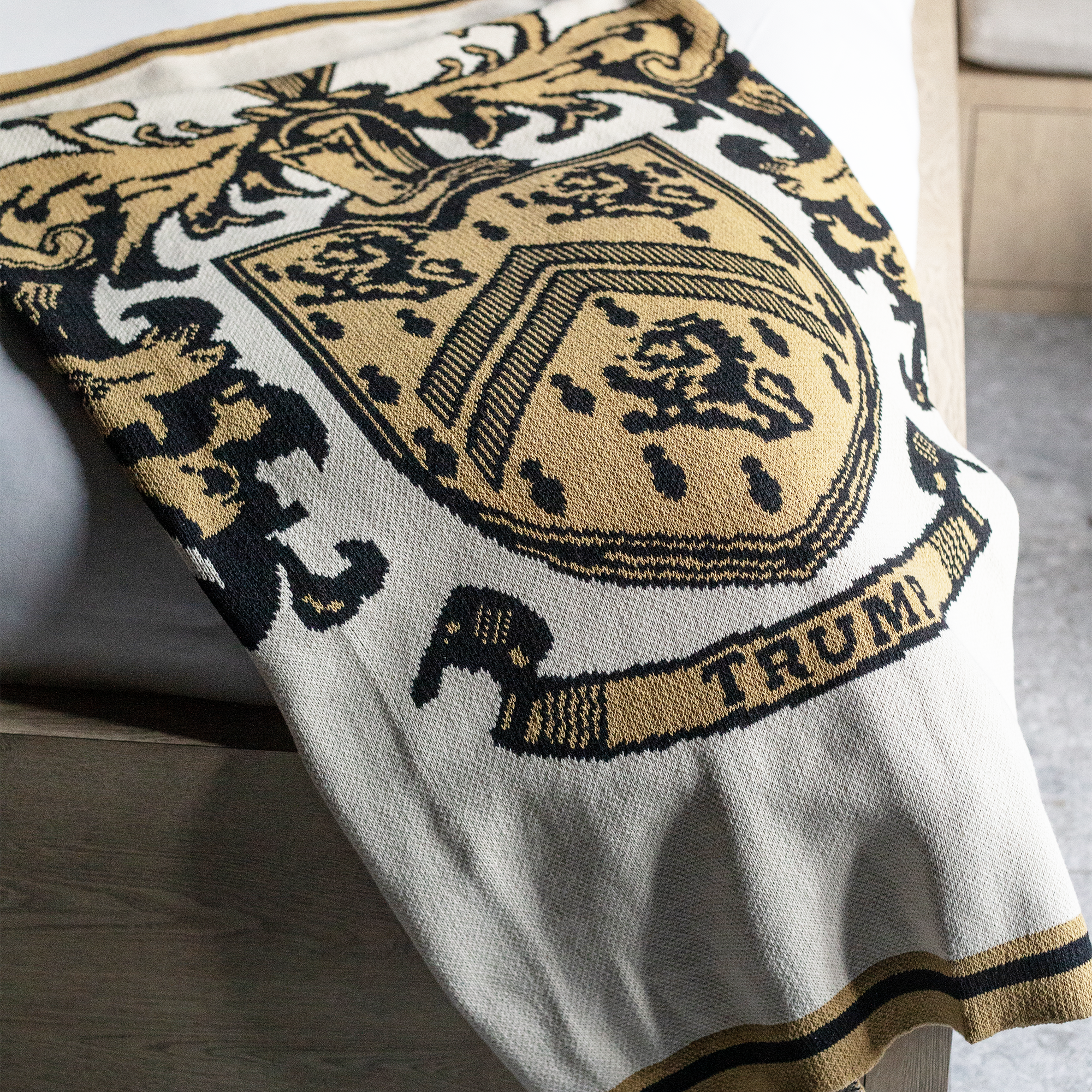 Curl up in luxury with this high quality knitted cotton throw. The elevated Trump color palette is the perfect compliment to any home decor, and the beautifully woven TRUMP shield logo looks stately no matter how you style it across your furniture.