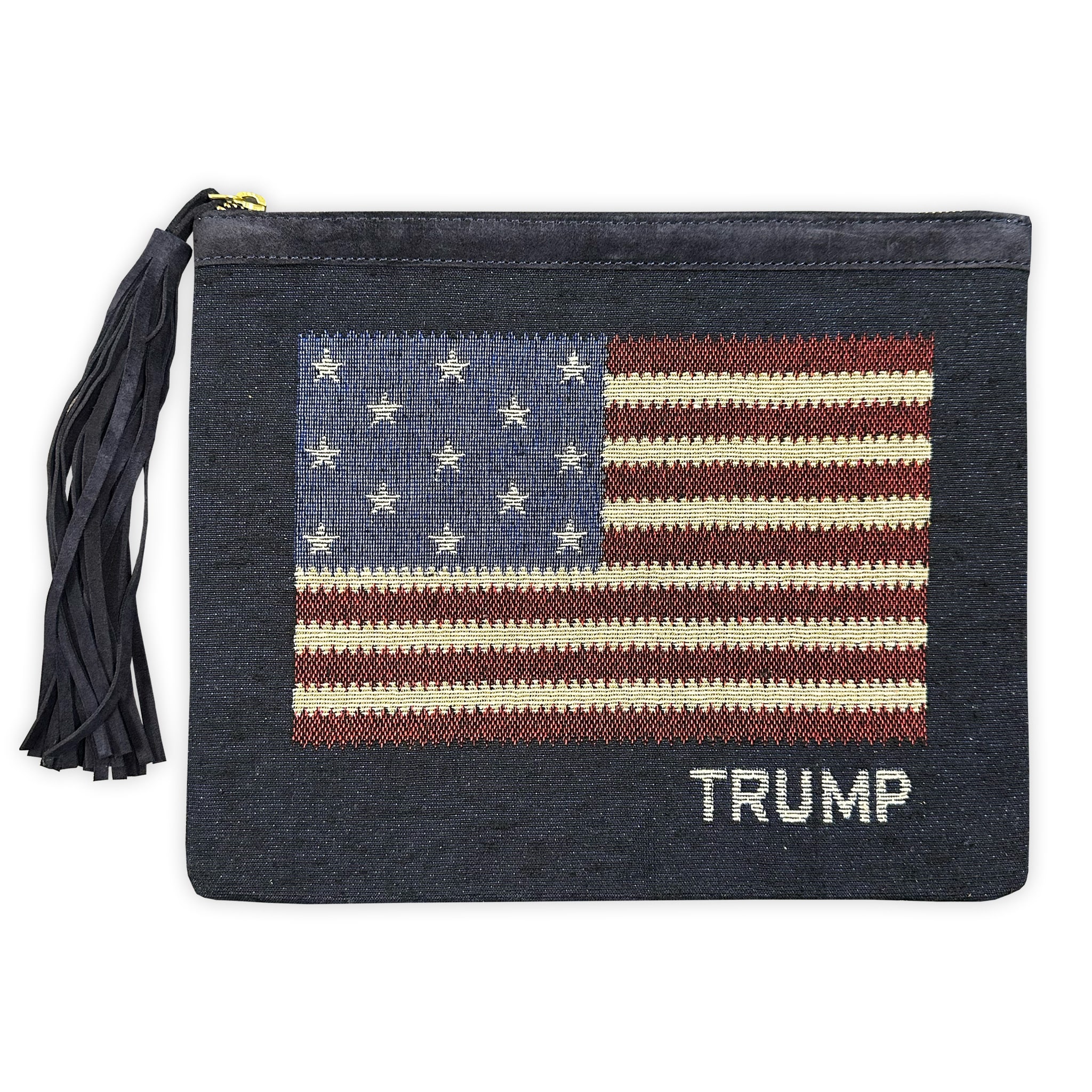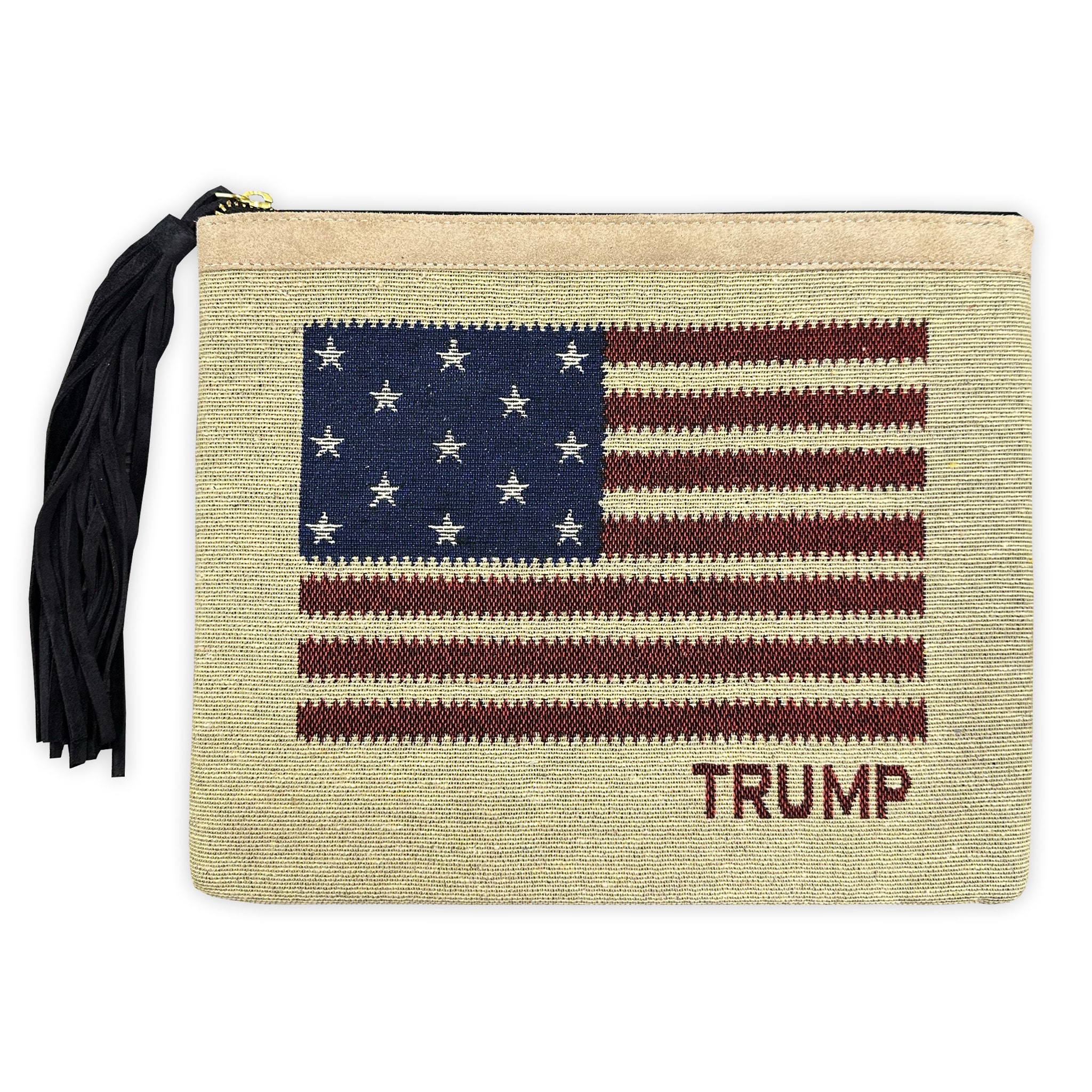 Carry cash, cards, lip sticks and more with the USA pouch featuring the TRUMP name. With a cute tassel zipper pull, this pouch makes a great gift for anyone who loves America.