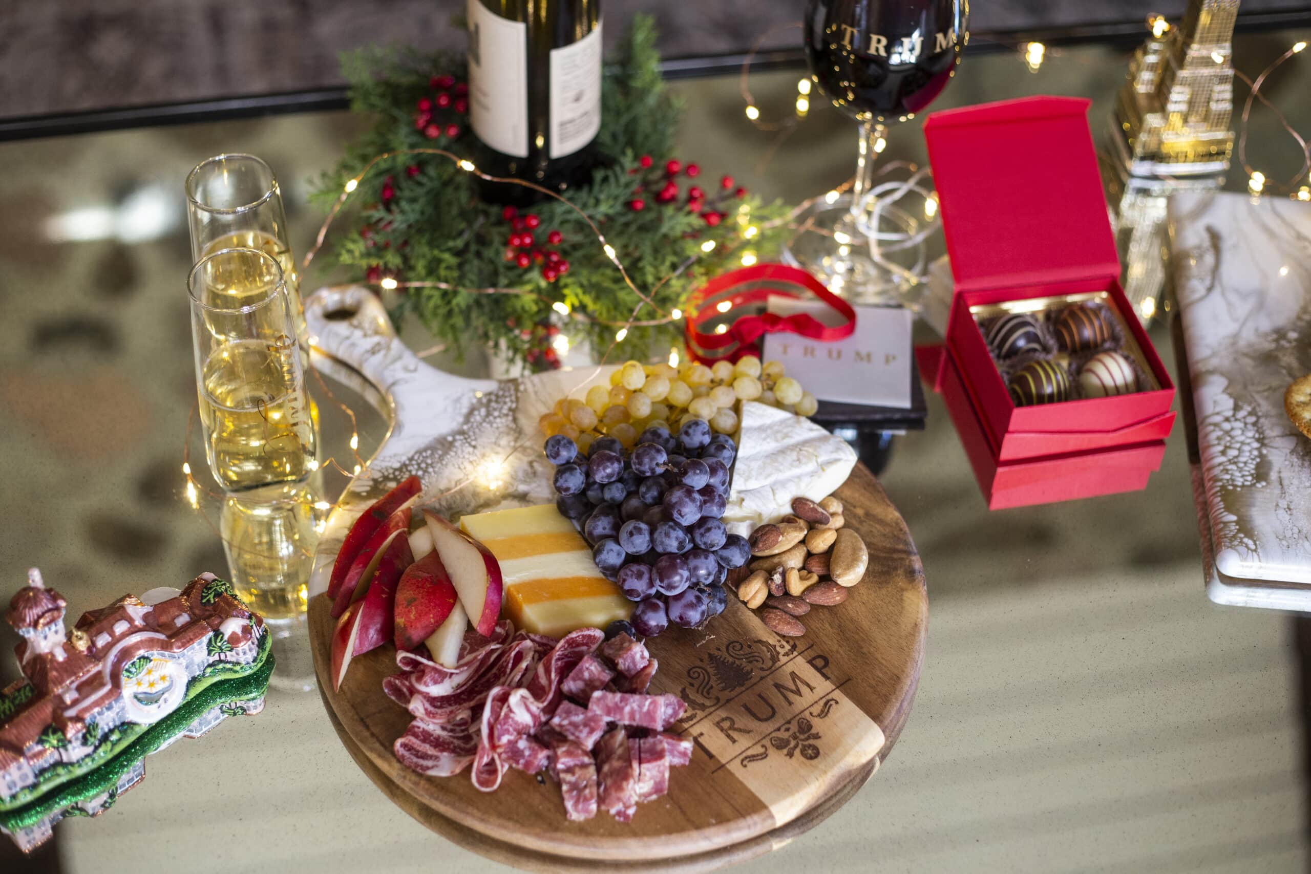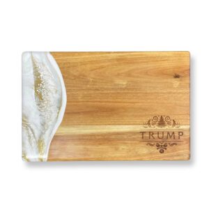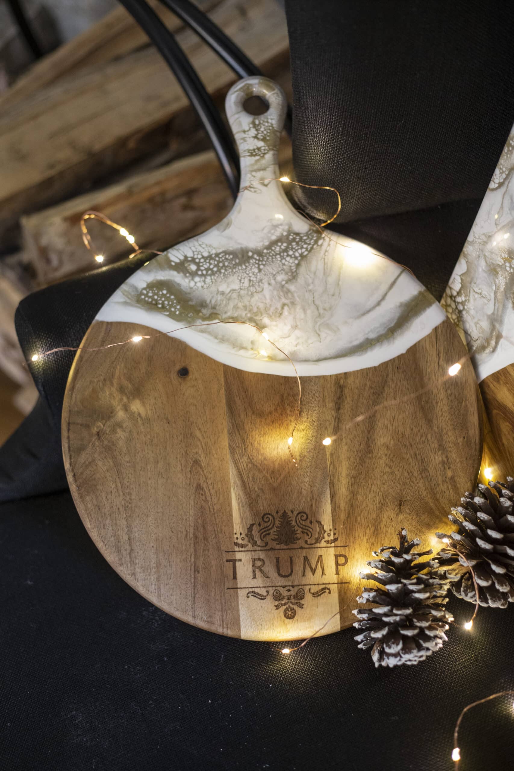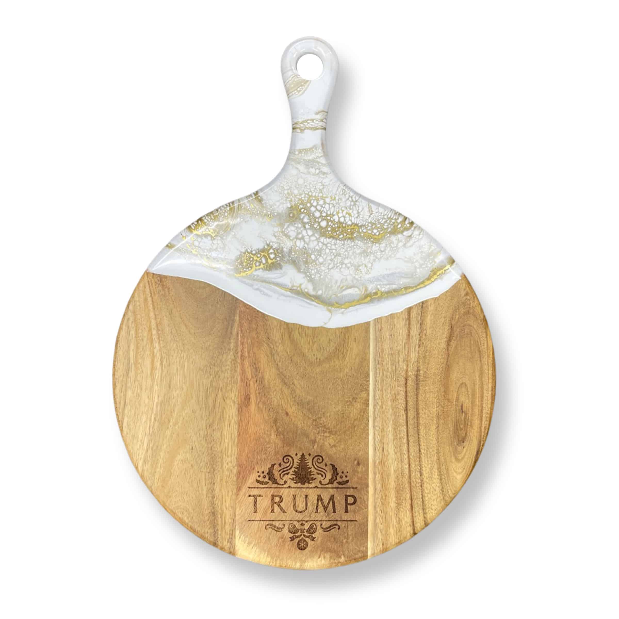 Wow everyone at your table with this exclusive Trump Holiday Round Cheese Paddle. These pieces blend gorgeous Acacia hardwood and an eco-friendly epoxy to create a one-of-a-kind piece of serveware for your home. These cheese boards are perfect for serving a group of 4-5 people.