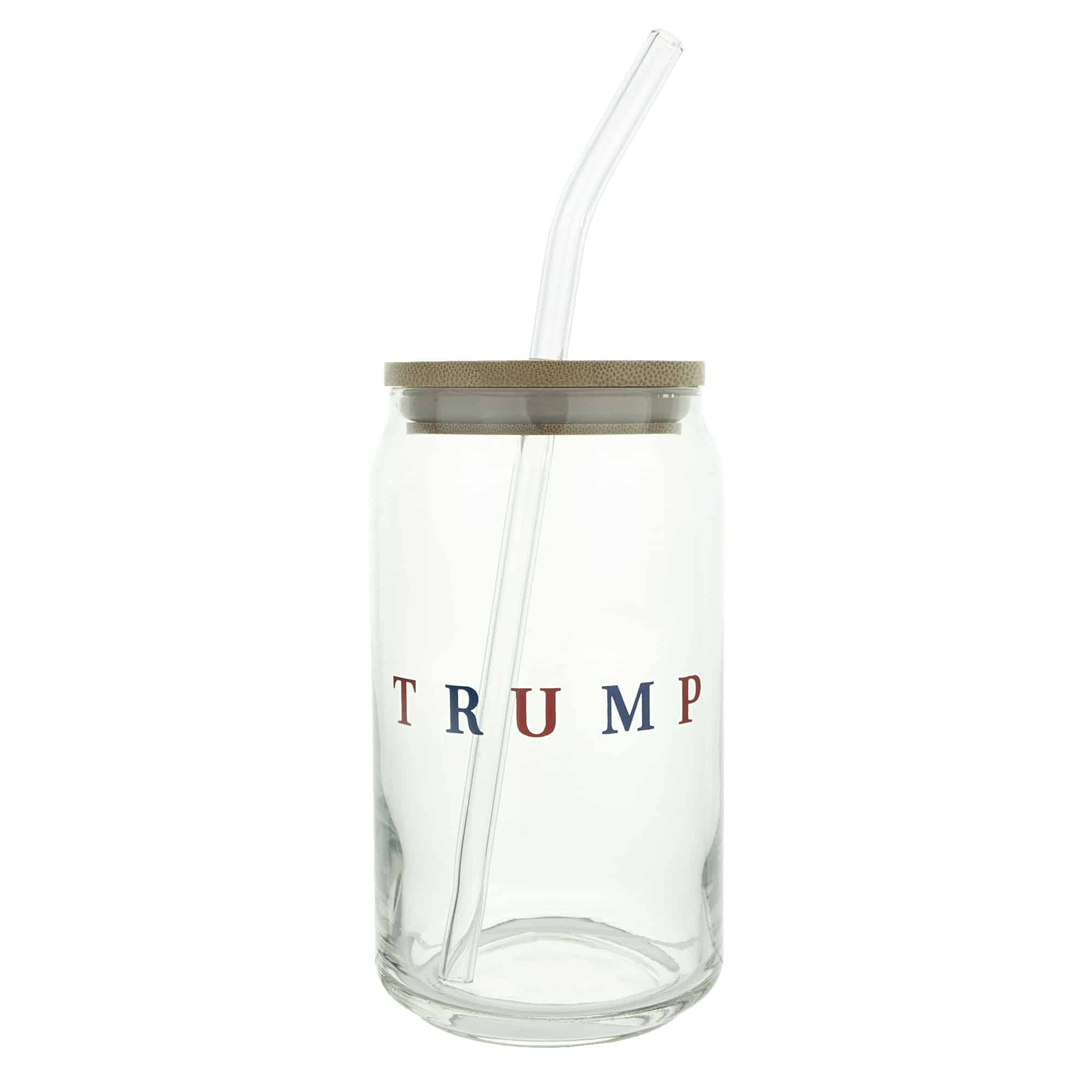 Sip in style with our all-glass straw cup. With TRUMP printed in red and blue, add your favorite drink and enjoy.