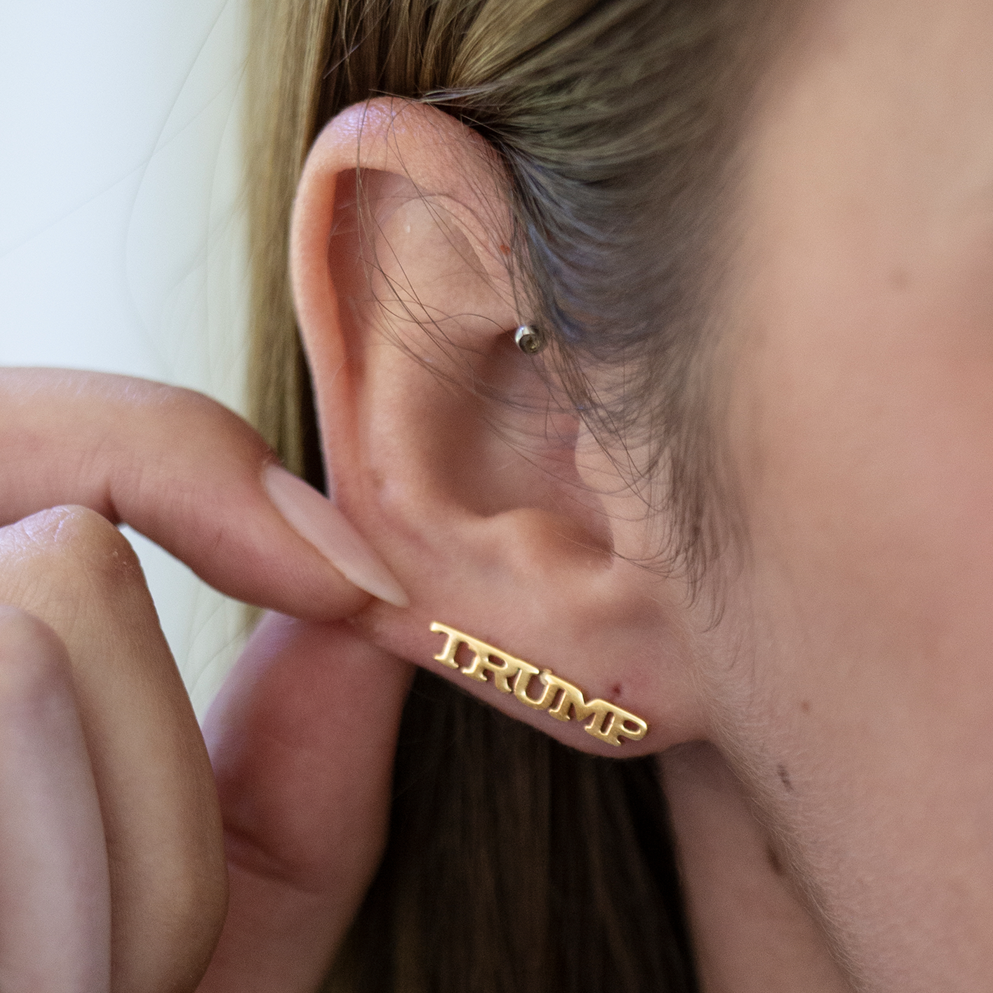 Bar earrings are all the rage, and with the summer of making America great in full swing, add this to your earring line up! TRUMP in all caps from left to right is the perfect stud to add to your ear.
