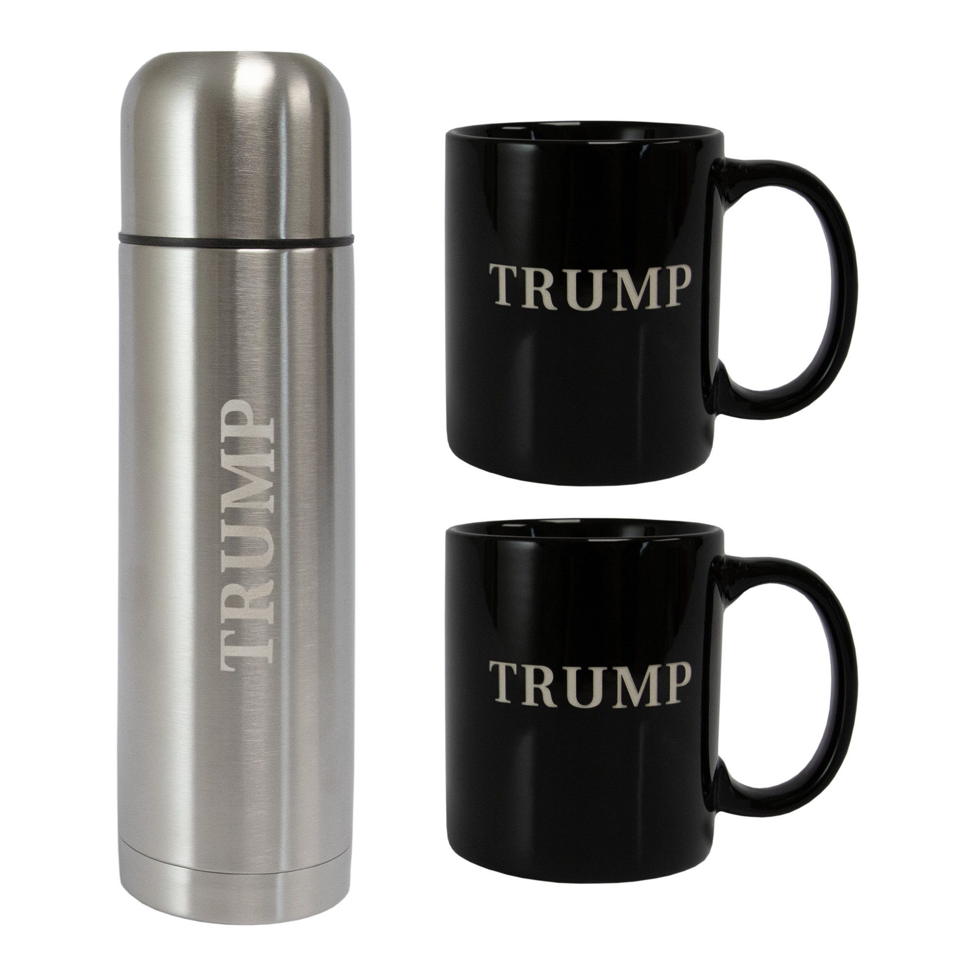 Start your mornings in style with this with the Trump To-Go Mug Set. Featuring a sleek thermos and two matching mugs, it’s perfect for coffee, tea, or your favorite fall beverages, whether at home, or on the road, or at the office.